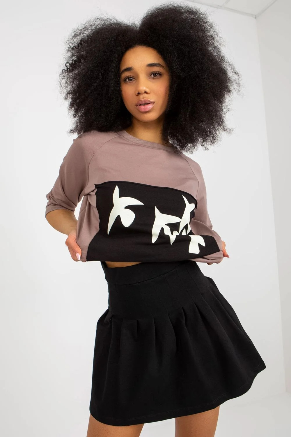 Tepláková souprava sestávající z halenky a sukně. Halenka s 3/4 rukávy a kulatým výstřihem. Ozdobný potisk na přední straně. Sukně s vyšším pasem, zapínání na zip a knoflík.