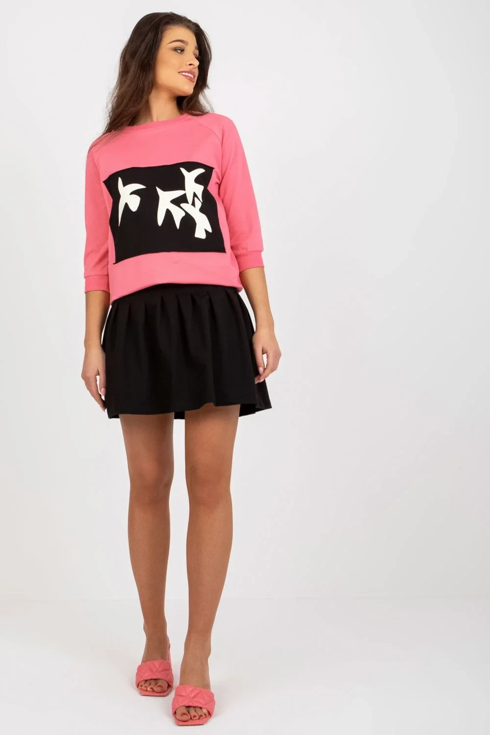 Tepláková souprava sestávající z halenky a sukně. Halenka s 3/4 rukávy a kulatým výstřihem. Ozdobný potisk na přední straně. Sukně s vyšším pasem, zapínání na zip a knoflík.