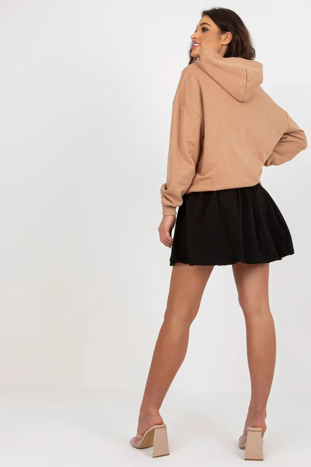 Tepláková souprava sestávající z mikiny a sukně. Halenka s dlouhými rukávy a kapucí. Ozdobný potisk na přední straně. Rozšířená sukně se skrytým zipem.
