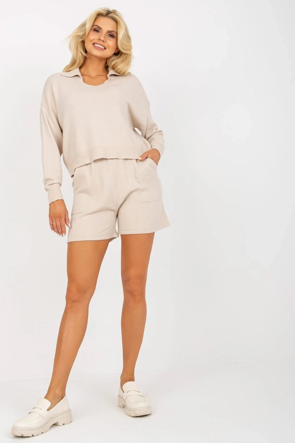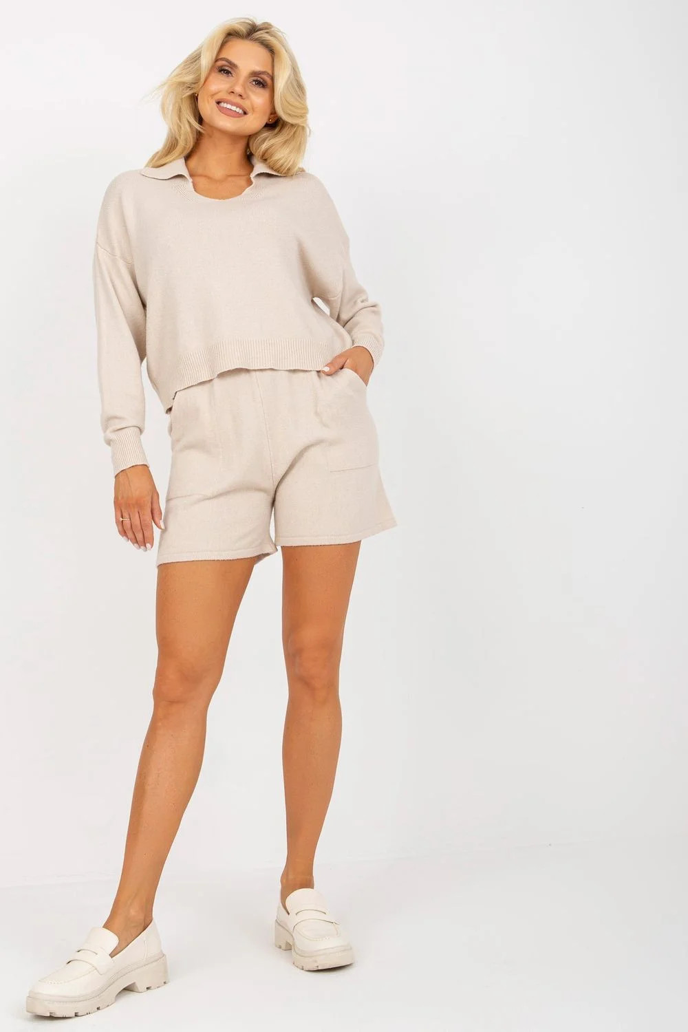 Ležérní souprava sestávající z šortek a svetru. Volný svetr s dlouhými rukávy. Krátké šortky s pružným pasem a kapsami.