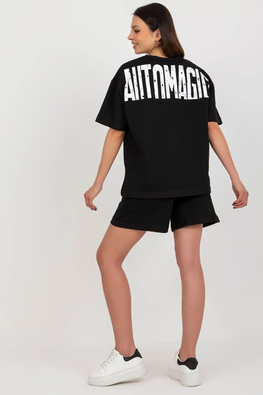 Bavlněná dámská souprava sestávající z halenky a šortek. Volná halenka s krátkými rukávy a kulatým výstřihem. Šortky se zavazováním v pase a nakládanými kapsami. Souprava s ozdobnými nášivkami.