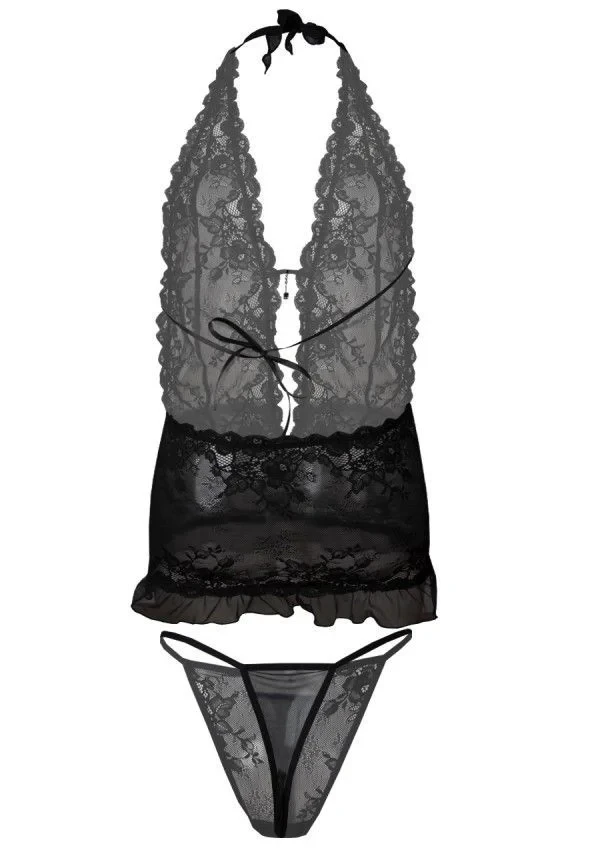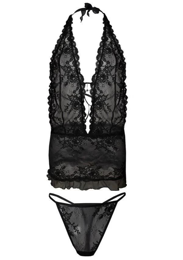 Krajková košilka s otevřenými zády. Intenzivní černá, sexy. Ideální pro sezónu jaro-léto, košíčky ve stylu braletky, prodloužené, zavazování za krkem. Krajka je měkká a pružná, střih je přizpůsobený tělu. Měkká guma na spodním lemu udržuje střih pěkně na těle. Tanga jsou součástí balení. Složení: 100% polyester.