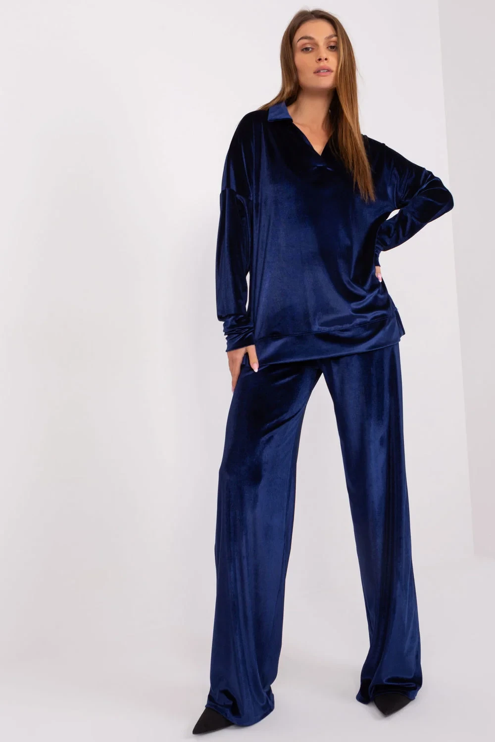 Tato velurová souprava je dokonalou kombinací pohodlí a stylu. Je vytvořena z jemné bavlny a při nošení poskytuje jedinečné pohodlí. Její hladký vzor jí dodává všestranný charakter, takže je ideální pro každodenní nošení, práci i odpočinek. Halenka s dlouhými rukávy má elegantní límcový výstřih, který dodává soupravě jemnou eleganci. Kalhoty se širokými nohavicemi a vysokým pasem jsou nejen módním akcentem, ale také zárukou pohodlí a atraktivního vzhledu. Praktické postranní kapsy dodávají soupravě funkčnost a činí ji stejně praktickou jako stylovou. Délka kalhot je ideální pro nošení v interiéru i mimo domov. Jedná se o ideální volbu pro ženy, které si cení pohodlí a volnosti, aniž by se vzdaly módního vzhledu.