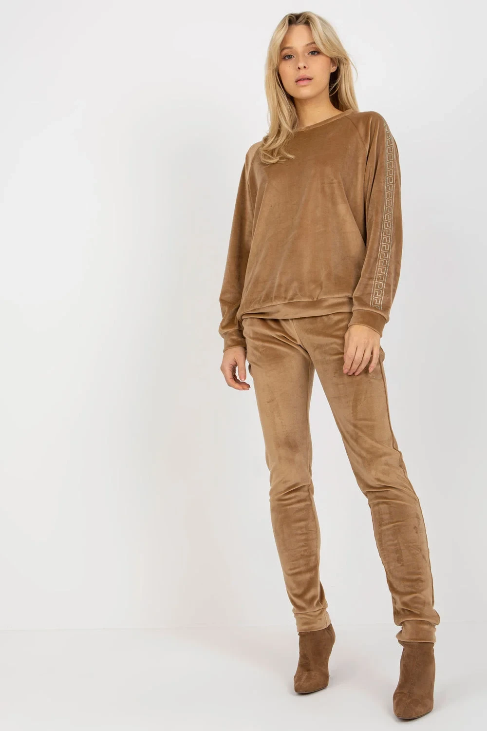 Velurový komplet sestávající z halenky a dlouhých kalhot. Halenka s dlouhými rukávy a kulatým výstřihem. Dlouhé kalhoty se šňůrkou v pase a kapsami na bocích. Rukávy zdobené kamínkovým vzorem.