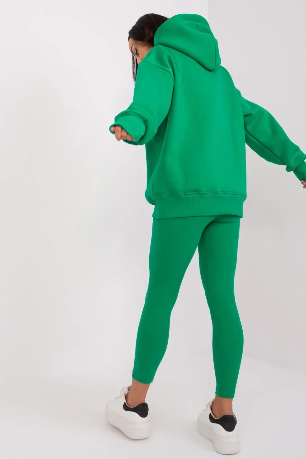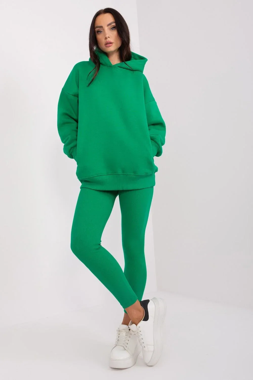 Tato dámská souprava kombinuje módní design a bezkonkurenční pohodlí a poskytuje jedinečný vzhled a volnost pohybu. Mikina je typickým představitelem ležérního stylu. Díky dlouhým rukávům a kapuci poskytuje pocit útulnosti a ochrany před chladem. Rukávy a spodní lem mikiny jsou zakončeny žebrovaným lemem, který působí moderně. Legíny v tomto kompletu se vyznačují žebrovanou tkaninou, která jim dodává jemný, texturovaný vzhled. Legíny s vysokým pasem vytvářejí dokonalou siluetu, která lichotí postavě, zatímco široký žebrovaný pás zajišťuje dokonalé přizpůsobení a pohodlné nošení. Široký stahovací pás legínám nejen dodává originalitu, ale také zajišťuje flexibilitu a dokonalé přizpůsobení individuálním preferencím. Vysoce kvalitní materiály použité při výrobě této soupravy zaručují nejen atraktivní vzhled, ale především volnost pohybu a pohodlné nošení. Je to ideální volba pro aktivní den nebo odpočinkový večer. Tato dámská souprava je volbou pro ženy, které ocení pohodlí, aniž by se vzdaly módního výrazu. Ideální pro mnoho příležitostí, od domácího odpočinku až po setkání s přáteli.
