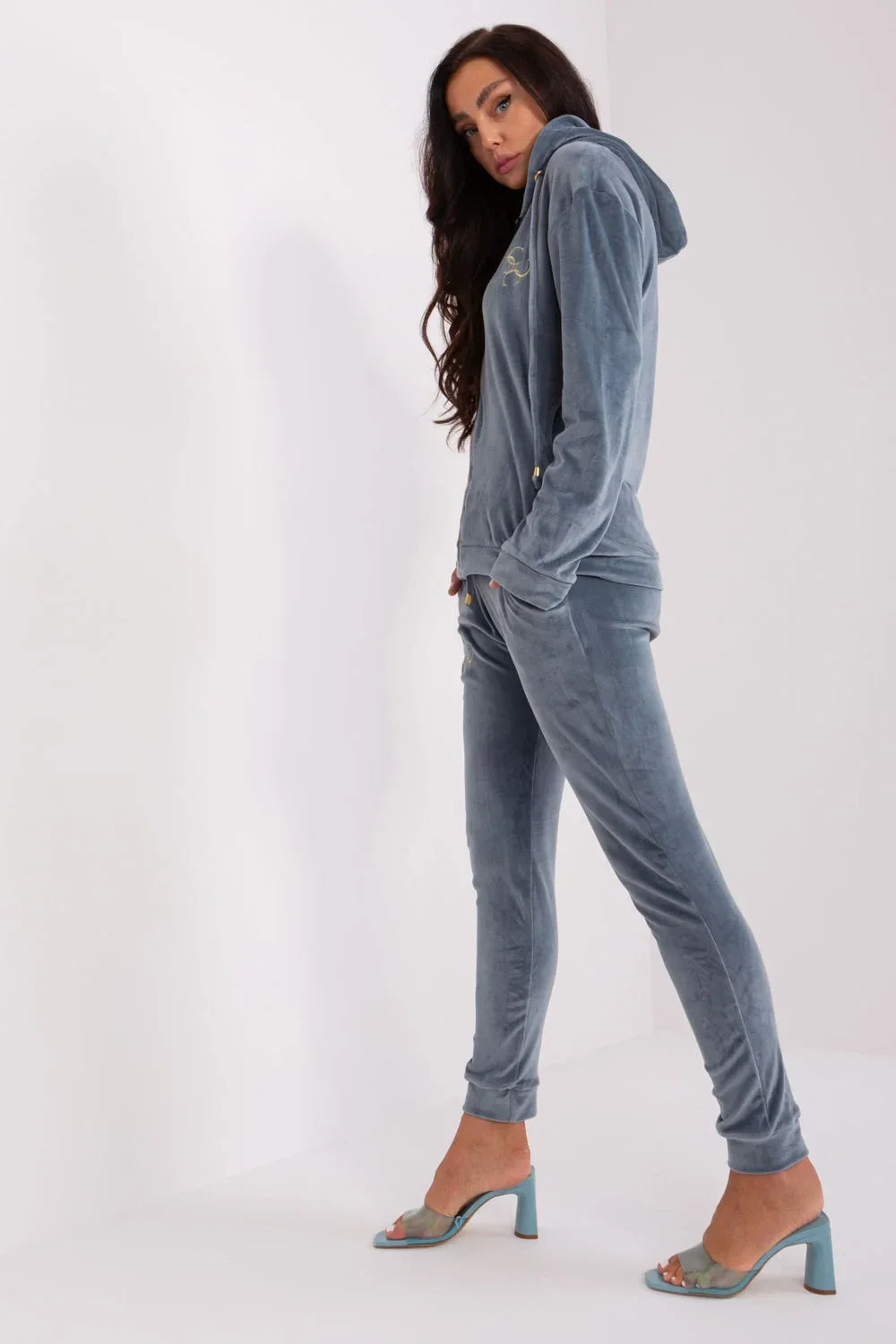 Velurová souprava sestávající z mikiny a kalhot. Mikina na zip s dlouhými rukávy, kapucí a kapsami. Dlouhé kalhoty se zavazováním v pase a bočními kapsami.