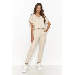 Elegantní a zároveň pohodlný pletený komplet, který kombinuje oversize košili s dlouhými kalhotami. Volná halenka s širokými krátkými rukávy zdobená půvabnou plaketou harmonicky ladí s odpovídajícími dlouhými kalhotami ve tvaru trubky, které jsou po celé délce zakončeny prošíváním. Kalhoty mají praktické boční kapsy. V tomto kompletu se budete cítit ležérně a sebevědomě a zároveň zůstanete elegantní. Skvěle se hodí na nošení do práce, a pokud chcete udělat dojem, nezapomeňte jej zkombinovat s jehlovými podpatky. Tento komplet je dokonalou kombinací smyslného stylu a pohodlí pro sebevědomé ženy.