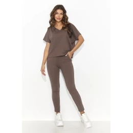 Elegantní a zároveň pohodlný pletený komplet, který kombinuje oversize košili s dlouhými kalhotami. Volná halenka s širokými krátkými rukávy zdobená půvabnou plaketou harmonicky ladí s odpovídajícími dlouhými kalhotami ve tvaru trubky, které jsou po celé délce zakončeny prošíváním. Kalhoty mají praktické boční kapsy. V tomto kompletu se budete cítit ležérně a sebevědomě a zároveň zůstanete elegantní. Skvěle se hodí na nošení do práce, a pokud chcete udělat dojem, nezapomeňte jej zkombinovat s jehlovými podpatky. Tento komplet je dokonalou kombinací smyslného stylu a pohodlí pro sebevědomé ženy.