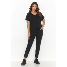 Elegantní a zároveň pohodlný pletený komplet, který kombinuje oversize košili s dlouhými kalhotami. Volná halenka s širokými krátkými rukávy zdobená půvabnou plaketou harmonicky ladí s odpovídajícími dlouhými kalhotami ve tvaru trubky, které jsou po celé délce zakončeny prošíváním. Kalhoty mají praktické boční kapsy. V tomto kompletu se budete cítit ležérně a sebevědomě a zároveň zůstanete elegantní. Skvěle se hodí na nošení do práce, a pokud chcete udělat dojem, nezapomeňte jej zkombinovat s jehlovými podpatky. Tento komplet je dokonalou kombinací smyslného stylu a pohodlí pro sebevědomé ženy.