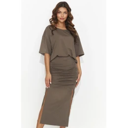 Souprava plná ženskosti a volnosti, vyrobená z měkkého úpletu příjemného na dotek. Vrchní díl tvoří volné tričko s širokými krátkými rukávy, zdobené půvabnou halenkou. Spodní díl tvoří vypasovaná dlouhá sukně se dvěma rozparky, zdůrazňující boky elegantním pasem. V této soupravě se budete cítit pohodlně a zároveň nesmírně smyslně. Skvěle se hodí pro nejrůznější příležitosti od práce až po výjimečné schůzky. Tento komplet je dokonalou kombinací elegance a pohodlí, ideální pro ženy, které ocení ležérní a zároveň stylový vzhled.