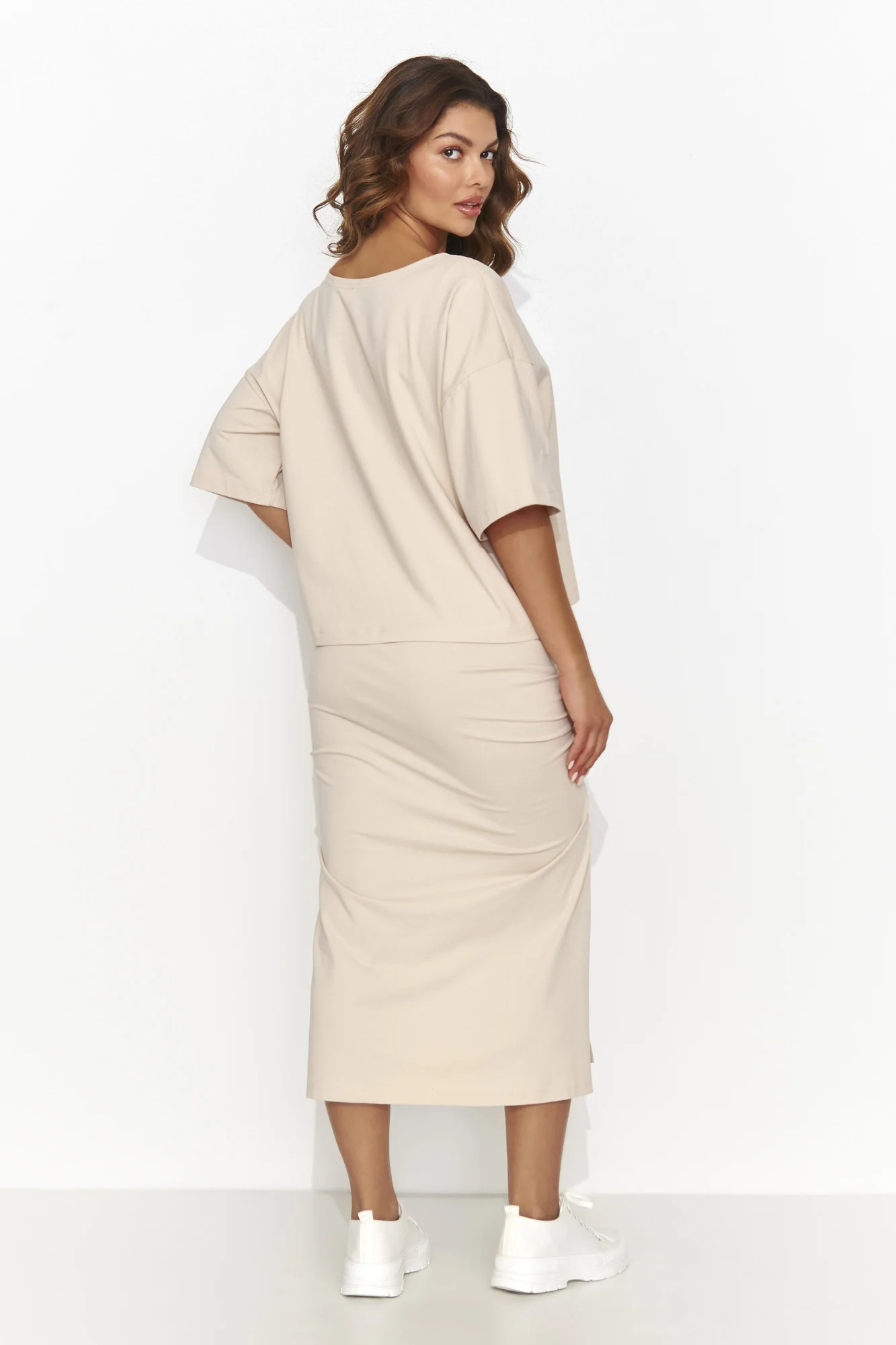 Souprava plná ženskosti a volnosti, vyrobená z měkkého úpletu příjemného na dotek. Vrchní díl tvoří volné tričko s širokými krátkými rukávy, zdobené půvabnou halenkou. Spodní díl tvoří vypasovaná dlouhá sukně se dvěma rozparky, zdůrazňující boky elegantním pasem. V této soupravě se budete cítit pohodlně a zároveň nesmírně smyslně. Skvěle se hodí pro nejrůznější příležitosti od práce až po výjimečné schůzky. Tento komplet je dokonalou kombinací elegance a pohodlí, ideální pro ženy, které ocení ležérní a zároveň stylový vzhled.