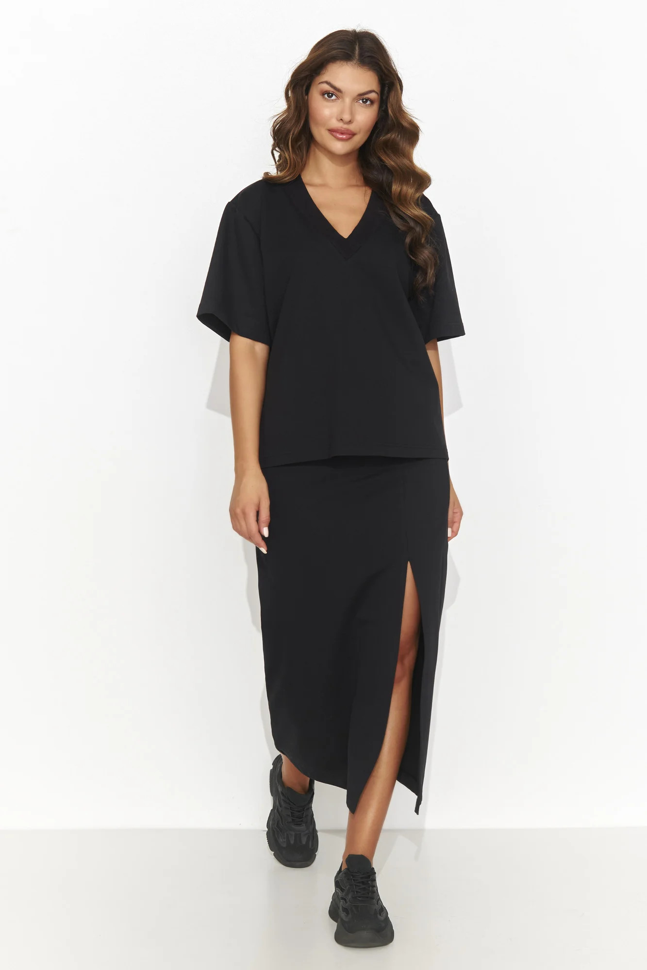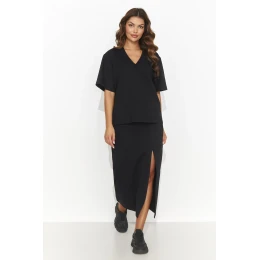 Dámská souprava, která vyzařuje eleganci a ležérnost a skládá se z tužkové sukně ke kolenům s jemným rozparkem a volné košile s krátkým rukávem a výstřihem do V. Poutavým detailem je ozdobná zlatá destička umístěná na zadní straně blůzy, která dodává nádech jemné extravagance. Tato souprava je k dispozici ve třech okouzlujících barvách: světle béžové, černé a čokoládové, což vám umožní přizpůsobit ji různým příležitostem a stylizacím. Tužková sukně zvýrazňuje ženskou siluetu a zároveň umožňuje pohodlné nošení, zatímco volná košile dodává lehkost a volnost. Jedná se o dokonalou kombinaci klasiky a moderny, která jistě zaujme módní fanoušky.