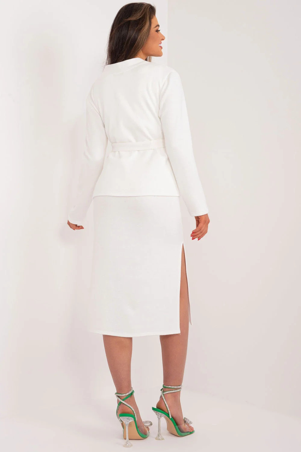 Souprava svetr a šaty je vynikající volbou pro ženy, které si cení pohodlí i stylu v každodenních situacích i při práci. Oba prvky této soupravy vypadají mimořádně působivě a vytvářejí harmonický a sladěný vzhled. Šaty bez rukávů s kulatým výstřihem vyzařují ležérnost a lehkost a dokonale ladí s každodenním stylem. Rozparky na bocích ve spodní části šatů jim dodávají trochu nonšalance, přičemž zůstávají v souladu se současnými módními trendy. Svetr, který soupravu doplňuje, má dlouhé rukávy, takže je ideální volbou pro chladnější dny. Pásek připevněný ke svetru je elegantním detailem a zároveň spojuje oba kousky v jeden celek. Dominantním vzorem je hladký povrch, díky čemuž je souprava univerzální a snadno kombinovatelná s dalšími kousky ve vašem šatníku. Díky ležérnímu stylu je tato souprava skvělou volbou pro různé příležitosti, ať už do práce, na neformální procházky nebo na setkání s přáteli. Tento set svetr plus šaty je určen pro ženy, které chtějí spojit pohodlí s módním výrazem a zároveň vytvořit stylový a funkční komplet, který se uplatní v různých situacích.
