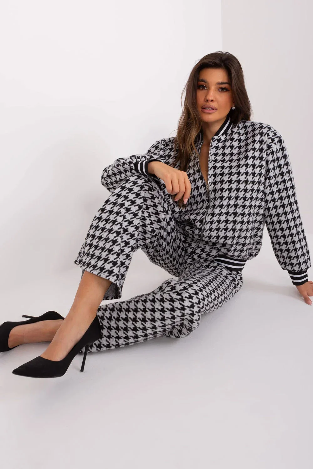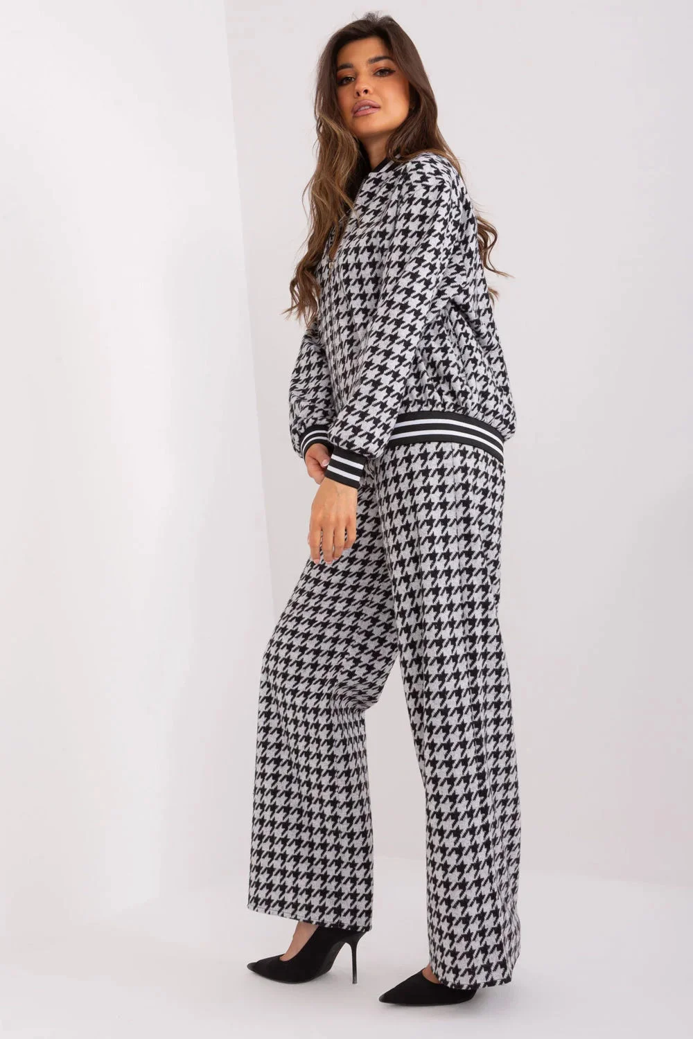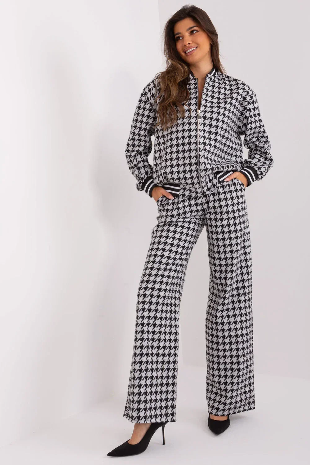 Ležérní souprava sestávající z mikiny a kalhot. Mikina na zip, stojáček a kapsy jsou dokonalou kombinací pohodlí a ležérního stylu, ideální pro různé příležitosti, od každodenních aktivit až po pracovní dny. Mikina je vyrobena převážně z bavlny, poskytuje příjemný pocit na kůži a zároveň se snadno udržuje. Stojatý límec dodává mikině moderní nádech a zároveň poskytuje ochranu před chladem v chladnějších dnech. Zip usnadňuje oblékání a svlékání mikiny, takže je praktická a snadno použitelná. Praktickým a zároveň stylovým doplňkem jsou nakládané kapsy, do kterých si můžete uložit drobné předměty nebo si zahřát ruce. Široké kalhoty s vysokým pasem jsou dokonalým doplňkem ležérního kompletu. Díky pohodlnému střihu jsou kalhoty ideální pro každodenní aktivity i pro pracovní dny a zaručují volnost pohybu. Praktičnost jim dodávají nakládané kapsy, do kterých si můžete uložit drobné předměty. Dominantní geometrický vzor dodává soupravě jedinečný nádech a podtrhuje individuální styl nositele. Díky této elegantní kombinaci mikiny a kalhot je tato souprava nejen pohodlná, ale také módní a stylová. Díky ležérnímu stylu je tato souprava vhodná na každodenní vycházky, do práce a také do chladnějších dnů, kdy jde pohodlí ruku v ruce s módním vzhledem. Je určena pro ženy, které oceňují praktičnost, pohodlí a styl v jednom.
