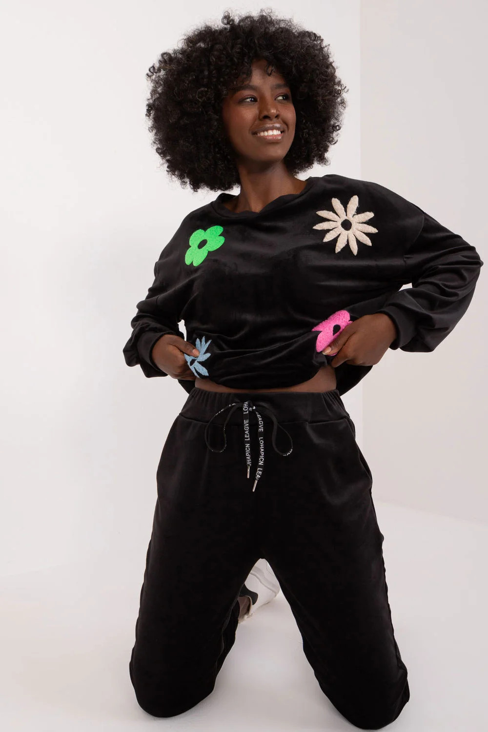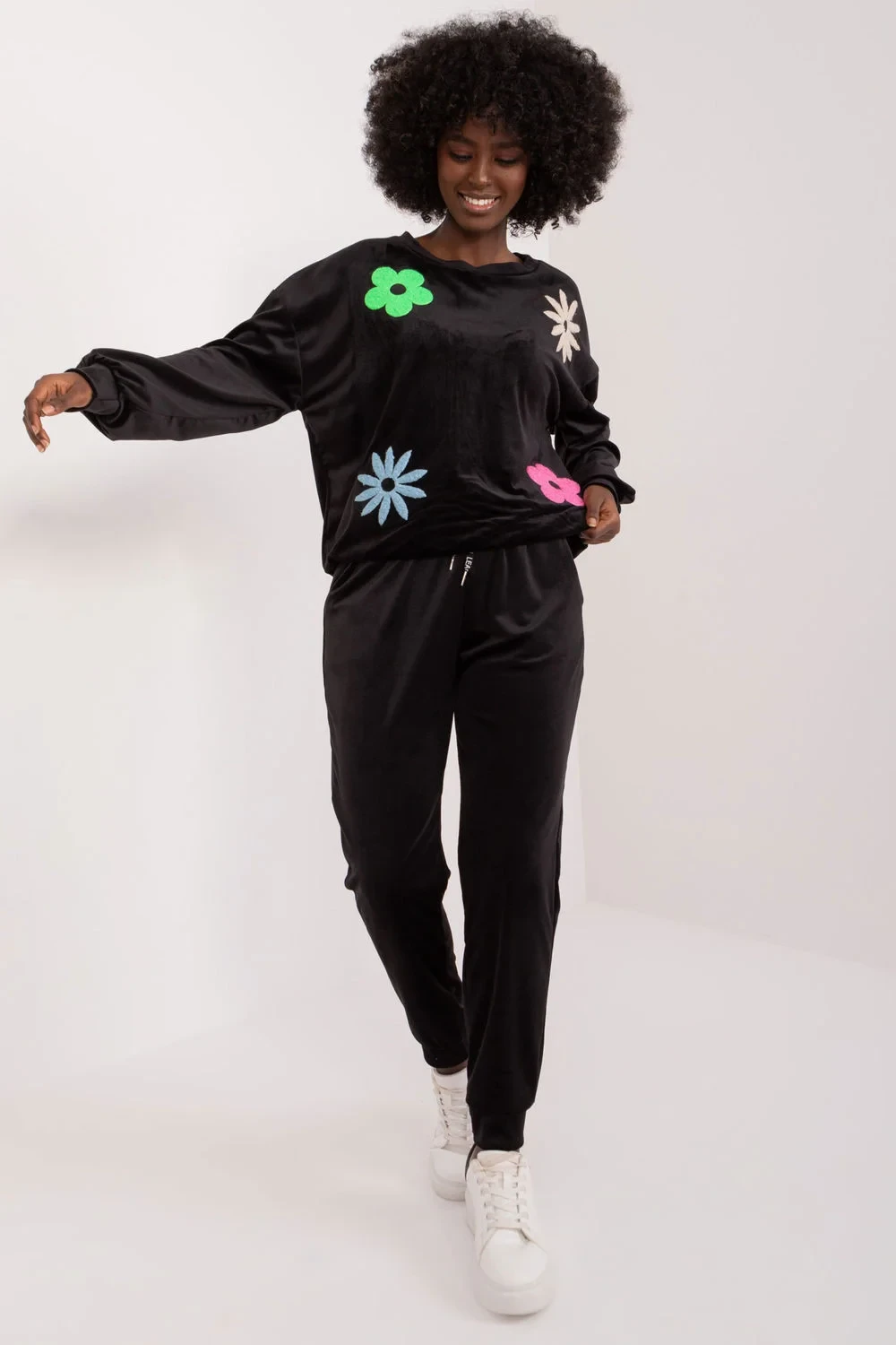 Velurová souprava, která se skládá z mikiny a kalhot, je kombinací elegance a pohodlí, ideální pro neformální chvíle odpočinku. Tato souprava, vytvořená s ohledem na pohodlí při nošení a módní vzhled, jistě upoutá pozornost svým jedinečným designem. Převažujícím materiálem je měkký polyester, který v kombinaci s velurovou úpravou poskytuje příjemný pocit na kůži. Soupravu zdobí na přední straně potisk květin, který jí dodává svěží a romantický nádech, ideální pro letní večery. Díky standardní délce halenky a kalhot je souprava praktická a univerzální. Stylizované žebrování na nohavicích kalhot dodává moderní, sportovní vzhled a zároveň umožňuje volnost pohybu. Kalhoty s vysokým pasem zvýrazňují pas, zatímco boční nakládané kapsy na kalhotách jsou praktické a stylové zároveň. Mikina s dlouhými rukávy a kulatým výstřihem je pohodlná a vhodná pro každodenní nošení. Celek vytváří harmonický obraz, v němž se snoubí elegance a ležérnost. Velurová souprava s květinovým potiskem je ideální volbou pro milovníky ležérního stylu s nádechem romantiky.