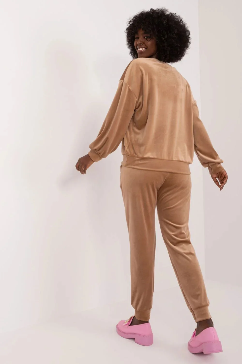 Velurová souprava, která se skládá z mikiny a kalhot, je kombinací elegance a pohodlí, ideální pro neformální chvíle odpočinku. Tato souprava, vytvořená s ohledem na pohodlí při nošení a módní vzhled, jistě upoutá pozornost svým jedinečným designem. Převažujícím materiálem je měkký polyester, který v kombinaci s velurovou úpravou poskytuje příjemný pocit na kůži. Soupravu zdobí na přední straně potisk květin, který jí dodává svěží a romantický nádech, ideální pro letní večery. Díky standardní délce halenky a kalhot je souprava praktická a univerzální. Stylizované žebrování na nohavicích kalhot dodává moderní, sportovní vzhled a zároveň umožňuje volnost pohybu. Kalhoty s vysokým pasem zvýrazňují pas, zatímco boční nakládané kapsy na kalhotách jsou praktické a stylové zároveň. Mikina s dlouhými rukávy a kulatým výstřihem je pohodlná a vhodná pro každodenní nošení. Celek vytváří harmonický obraz, v němž se snoubí elegance a ležérnost. Velurová souprava s květinovým potiskem je ideální volbou pro milovníky ležérního stylu s nádechem romantiky.