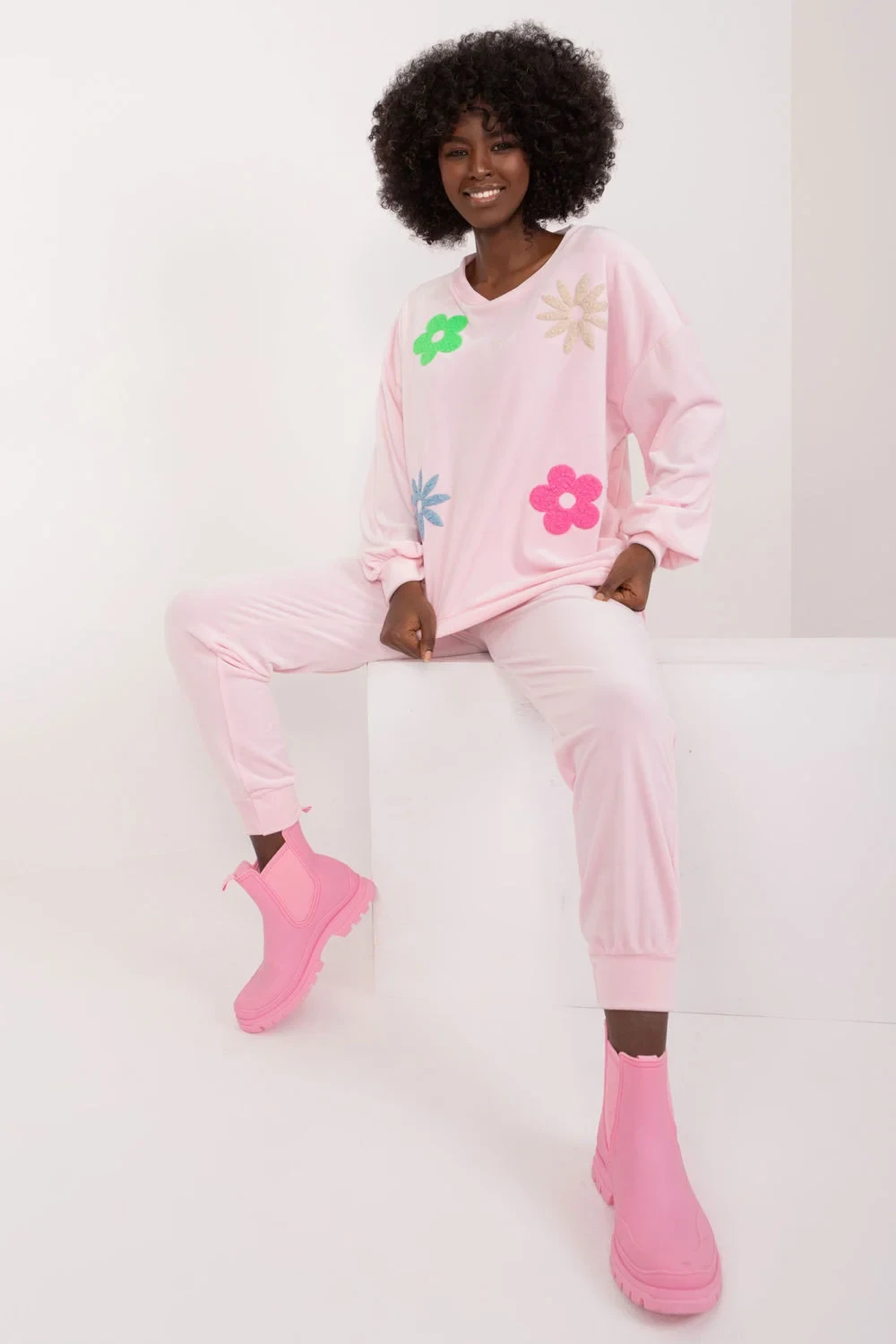 Velurová souprava, která se skládá z mikiny a kalhot, je kombinací elegance a pohodlí, ideální pro neformální chvíle odpočinku. Tato souprava, vytvořená s ohledem na pohodlí při nošení a módní vzhled, jistě upoutá pozornost svým jedinečným designem. Převažujícím materiálem je měkký polyester, který v kombinaci s velurovou úpravou poskytuje příjemný pocit na kůži. Soupravu zdobí na přední straně potisk květin, který jí dodává svěží a romantický nádech, ideální pro letní večery. Díky standardní délce halenky a kalhot je souprava praktická a univerzální. Stylizované žebrování na nohavicích kalhot dodává moderní, sportovní vzhled a zároveň umožňuje volnost pohybu. Kalhoty s vysokým pasem zvýrazňují pas, zatímco boční nakládané kapsy na kalhotách jsou praktické a stylové zároveň. Mikina s dlouhými rukávy a kulatým výstřihem je pohodlná a vhodná pro každodenní nošení. Celek vytváří harmonický obraz, v němž se snoubí elegance a ležérnost. Velurová souprava s květinovým potiskem je ideální volbou pro milovníky ležérního stylu s nádechem romantiky. Elastan 5 %