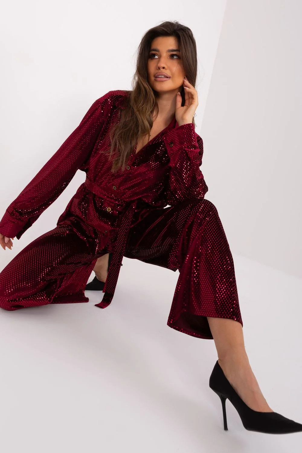 Elegantní souprava sestávající z košile a kalhot je ideální volbou pro zvláštní příležitosti, jako jsou večírky nebo slavnostní události. Tento styl vyzařuje luxus a smysl pro detail a je ideální pro situace, kdy je elegance klíčová. Zapnutá košile vypadá mimořádně elegantně a klasicky. Její střih zvýrazňuje siluetu a vysoký límec dodává elegantní nádech. Díky dlouhým rukávům je souprava vhodná i pro chladnější večery. Kalhoty mají rovné nohavice a vysoký náplet, který jim dodává elegantní charakter. Díky standardní délce jsou univerzální a vhodné pro různé příležitosti. Dalším ozdobným prvkem jsou zasouvací boční kapsy, které kalhotám dodávají také funkčnost. Dominantním vzorem jsou jemné flitrové aplikace, které soupravě dodávají třpyt a jedinečnost. Pásek na zavazování, který je součástí kompletní soupravy, zvýrazňuje pas a dodává mu elegantní vzhled. Tato elegantní souprava se bude skvěle hodit na večírky nebo slavnostní příležitosti a bude nositelku prezentovat mimořádně stylově a smyslně. Kombinuje klasickou eleganci s jemným nádechem módní svěžesti.