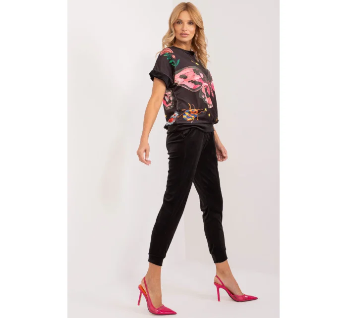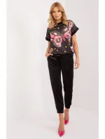 Tato velurová souprava je ideální pro ty, kteří si cení pohodlí a stylu na každý den. Skládá se z halenky a kalhot, které tvoří harmonickou dvojici ležérního vzhledu. Halenka, vyrobená z měkkého polyesteru, je opatřena potiskem, který jí dodává individuální nádech. Její krátké rukávy jí dodávají lehkost a ležérnost, ideální pro teplé dny. Kalhoty v jednobarevném provedení jsou dlouhé a pohodlné. Díky vysokému pasu se stahovací šňůrkou v pase se přizpůsobí siluetě pro pohodlné celodenní nošení. Boční nakládané kapsy jsou navíc praktickým prvkem pro bezpečné uložení drobných předmětů. Stahování nohavic na šňůrku dodává kalhotám ležérní vzhled a zároveň jim dodává nádech sportovního looku. Díky svému ležérnímu stylu se tato velurová souprava stane nezbytnou součástí vašeho každodenního šatníku a dodá pohodlí a styl v každé situaci.