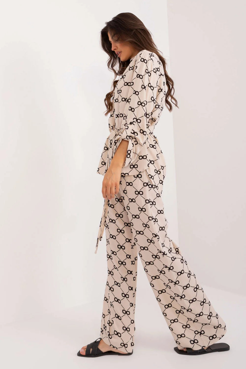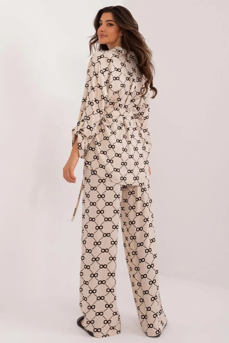 Objevte dámský letní komplet skládající se z elegantní košile a pohodlných kalhot. Tento set je ideální volbou pro každodenní nošení, nabízející kombinaci pohodlí a stylu. Elegantní košile s knoflíkovým zapínáním usnadňuje oblékání a svlékání. Náhradní pásek na vázání v pase zdůrazňuje postavu a přidává šarm. Košile má dlouhé rukávy, což ji činí vhodnou pro chladnější dny. Klasický límec dodává košili formální charakter, který skvěle vyváží s jejím ležérním stylem. Kalhoty jsou vybaveny páskem na vázání v pasu, který umožňuje ideální přizpůsobení postavě. Přímé nohavice dělají kalhoty univerzálními a hodí se k mnoha stylizacím. Vysoký pas zajišťuje pohodlí a zdůrazňuje pas. Praktické vkládané boční kapsy přidávají funkčnost a pohodlí. Komplet je zdoben originálním potiskem, který přitahuje pozornost a dodává svěžest každému outfitu.