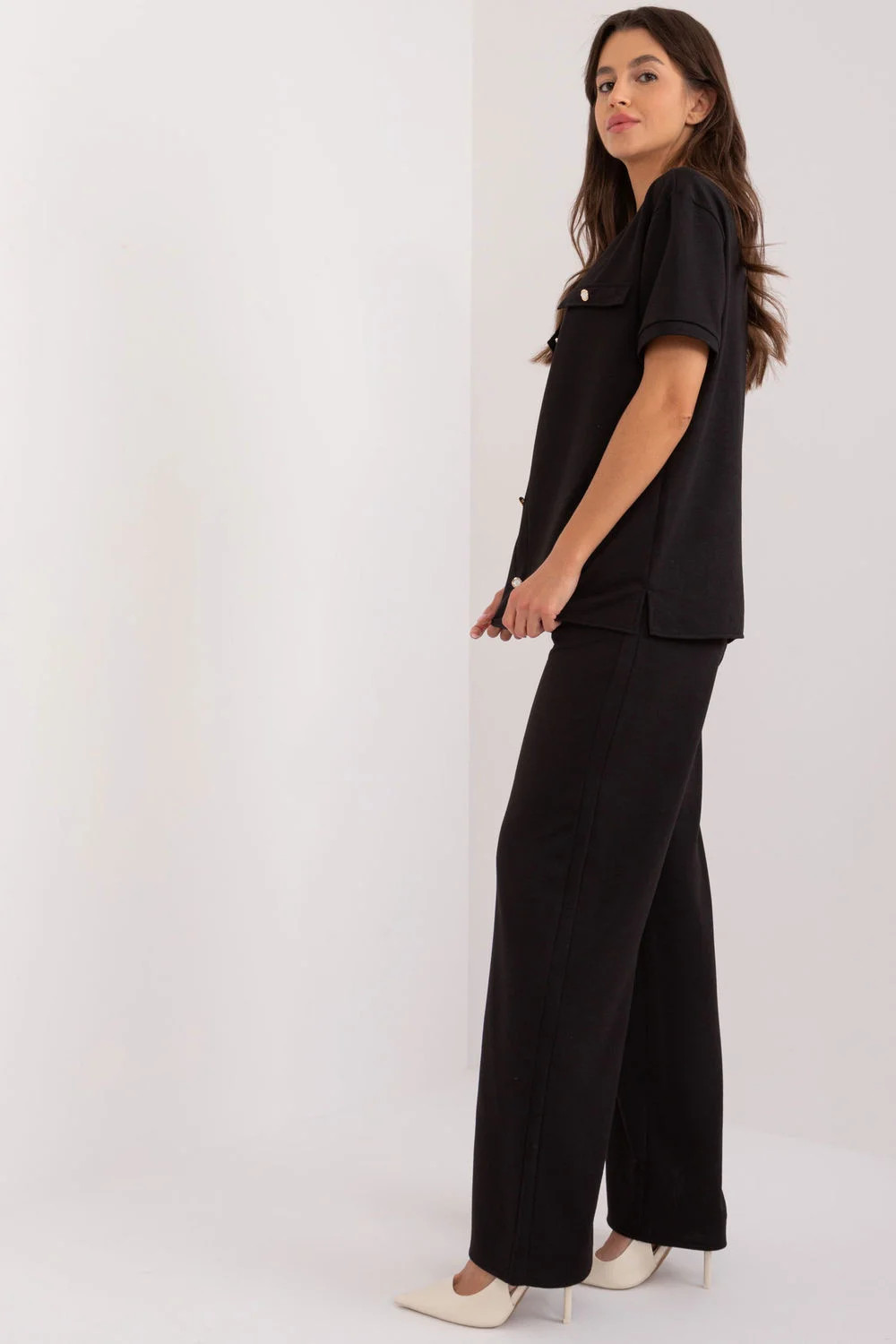 Představujeme nový dámský set, který se skládá z elegantní blůzy a pohodlných kalhot. Tato sada je ideální kombinací stylu a pohodlí, skvěle se hodí jak na každodenní výlety, tak i do práce. Blůza je vyrobena z vysoce kvalitního hladkého materiálu, který jí dodává eleganci a univerzálnost. Krátké rukávy zaručují, že blůza je ideální na teplejší dny a poskytují volnost pohybu. Klasický kulatý výstřih přidává blůze jemný šarm a hodí se k různým stylizacím. Ozdobné knoflíky na přední straně blůzy dodávají eleganci a jsou stylovým akcentem. Kalhoty jsou vybaveny praktickým vázáním v pase, které umožňuje ideální přizpůsobení siluetě a zdůrazňuje pas. Jsou vyrobeny z toho samého hladkého a jednolitého materiálu jako blůza, což vytváří souvislou a elegantní sadu. Přímé nohavice z nich činí klasické a všestranné, skvěle se kombinují s různými kusy oblečení. Vysoký pas zajišťuje pohodlné nošení a elegantní vzhled, zdůrazňuje siluetu. Praktické všité boční kapsy přidávají funkčnost, aniž by narušily elegantní vzhled kalhot. Tento dámský set, skládající se z blůzy a kalhot, je skvělou volbou pro ženy, které ocení pohodlí a styl. Hladký a jednotný materiál a klasické detaily zajišťují, že tato sada je ideální na každodenní výlety a do práce. Díky pečlivě vybraným prvkům, jako jsou ozdobné knoflíky na blůze a vázání v pase kalhot, budete vždy vypadat elegantně a cítit se pohodlně.