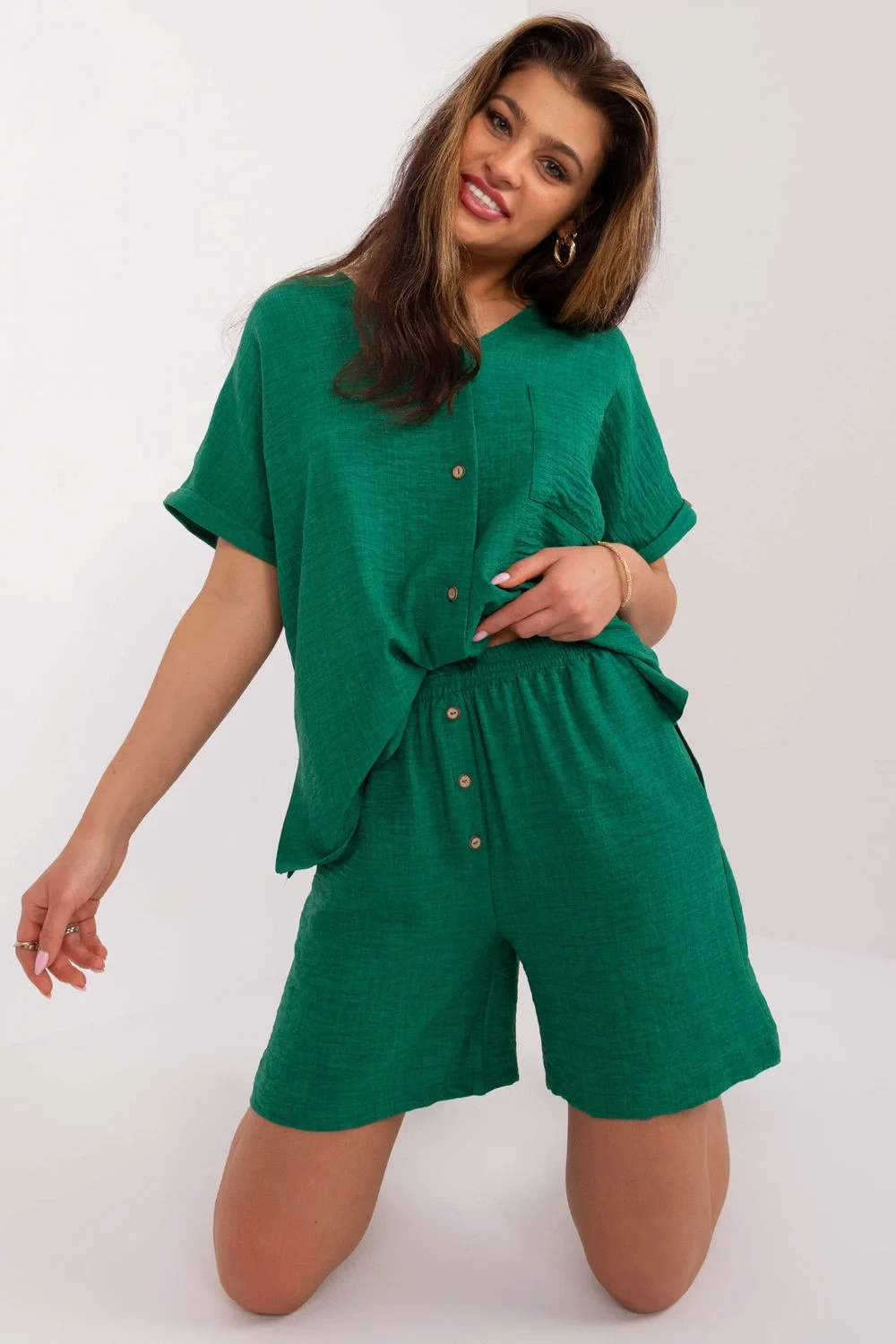 Tato elegantní a zároveň ležérní dámská souprava se skládá z trička a šortek a je ideální na každodenní vycházky. Hladký design a kombinace bavlny a polyesteru zajišťují pohodlí a trvanlivost. Šortky v délce ke kolenům se širokými nohavicemi a vysokým pasem zvýrazňují siluetu, zatímco boční kapsy dodávají praktičnost. Krátké rukávy a výstřih do V dodávají košili lehkost a letní styl, zatímco knoflíky na přední straně umožňují snadné oblékání. Jedná se o ideální volbu pro teplé dny, která kombinuje pohodlí a módní vzhled.