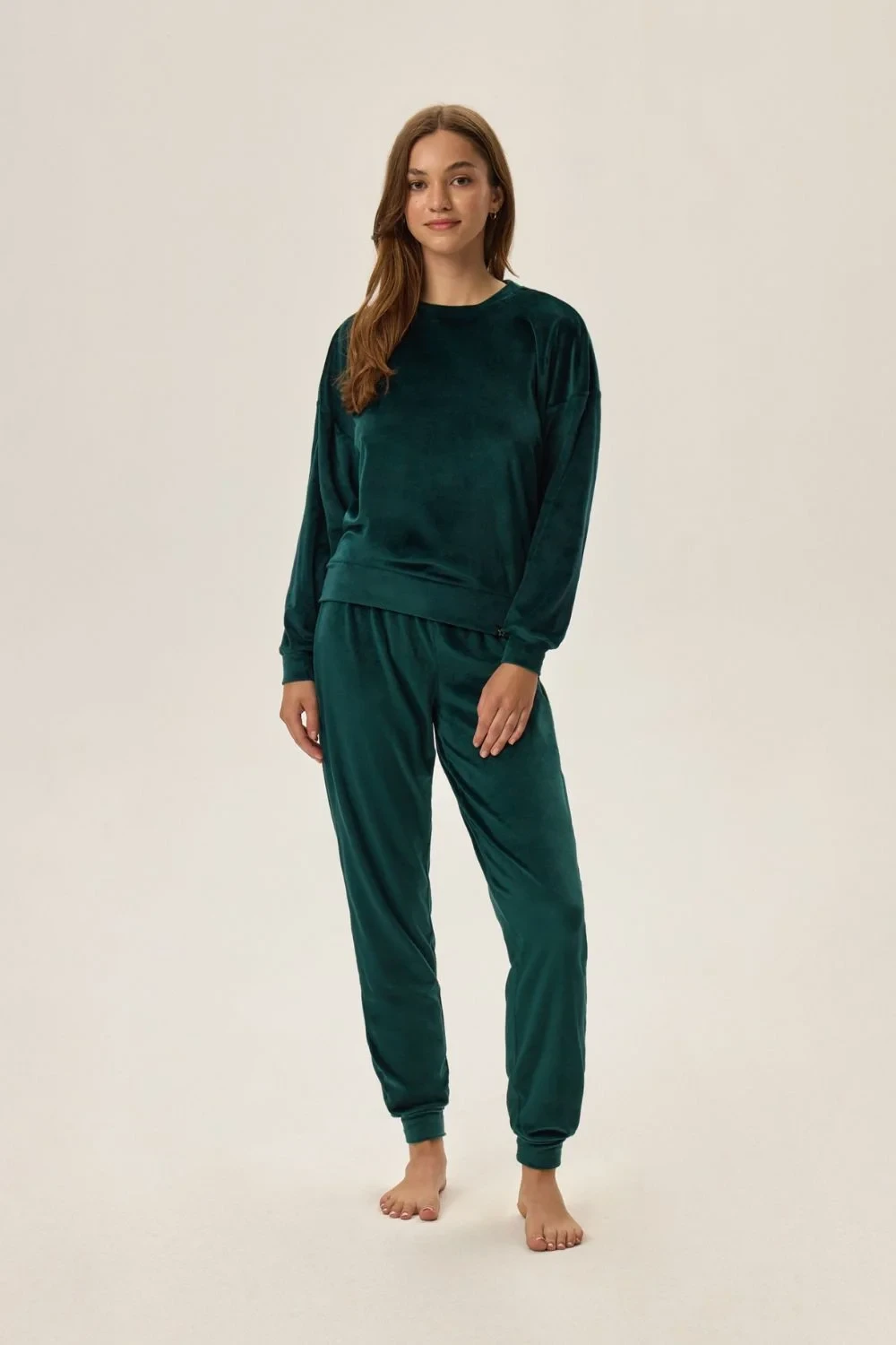 Pohodlí, volnost a móda, tato tři slova dokonale popisují sametový dresový set Fain. Jedná se o ženskou sadu, která se skládá z mikiny a dlouhých kalhot. Set je vyroben z příjemného sametového pletiva v módním tmavě zeleném odstínu. Pro lepší přizpůsobení se v pase nachází nekříživá guma a rukávy a nohavice jsou dokončeny pružnými lemy.