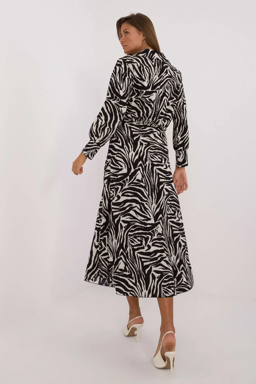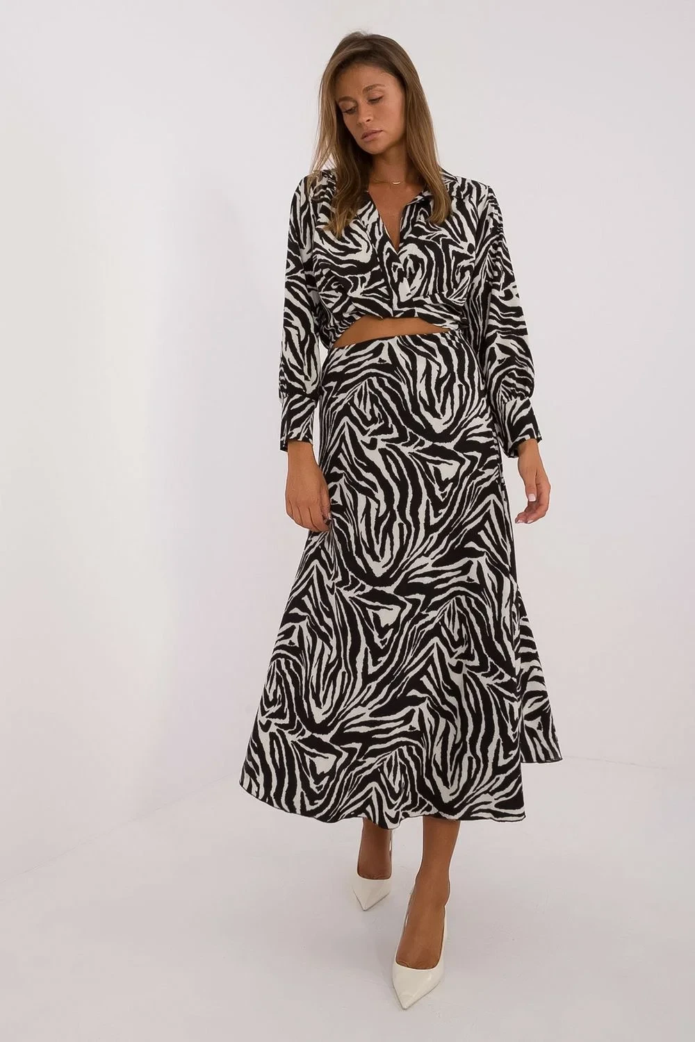 Stylový dámský komplet s motivem zvířat, ideální na každodenní příležitosti. Sada se skládá z blůzy a sukně, vyrobených z měkké směsi polyesteru a elastanu, co zajistí pohodlné nošení. Blůza s dlouhým rukávem má křížový výstřih s límečkem, co jí dodává elegantní a zároveň volný charakter. Sukně skvěle ladí s blůzou, tvoříce souvislou celkovou atmosféru. Tato sada je skvělou volbou na každý den, kdy chcete vypadat módně a cítit se pohodlně.