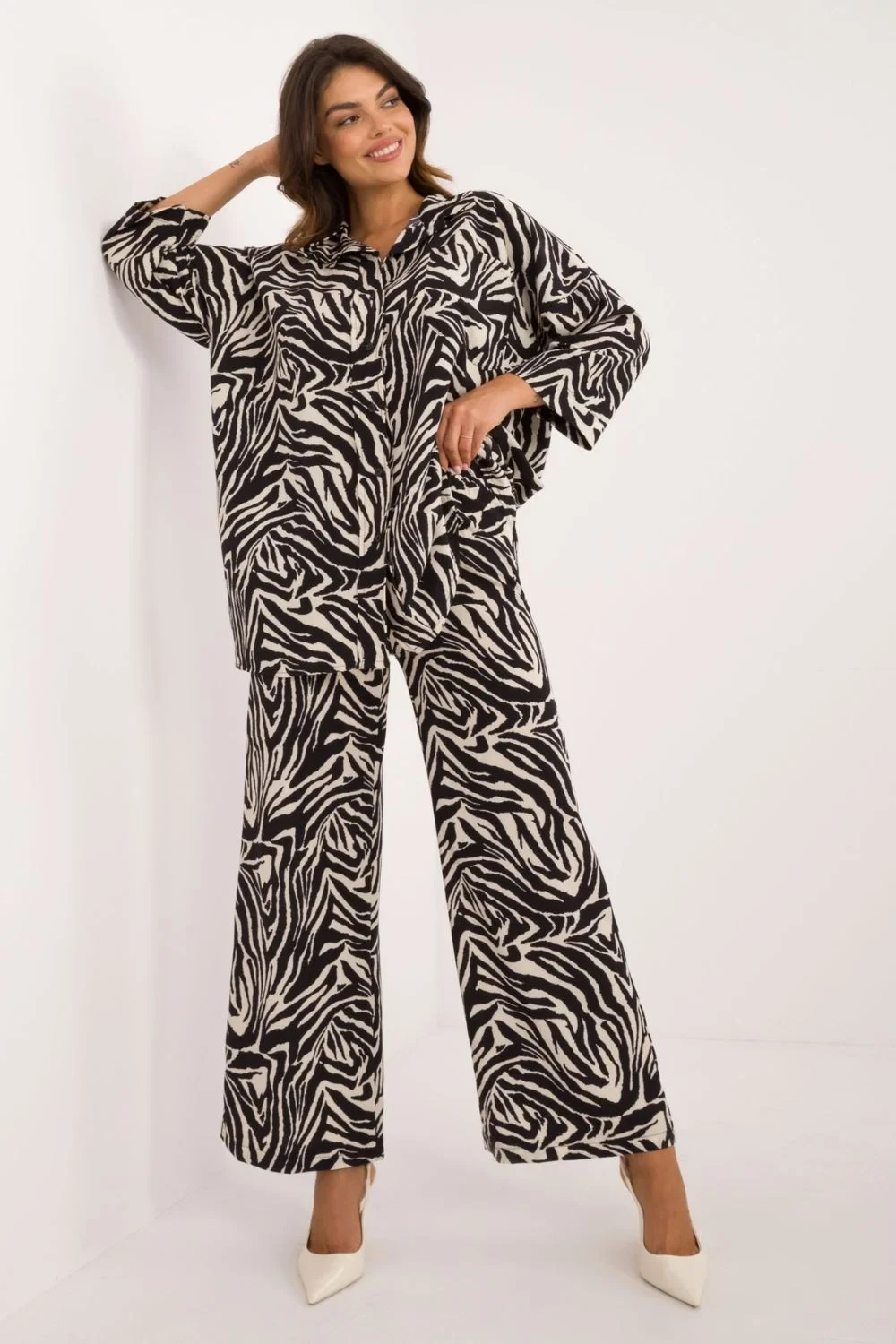 Sada skládající se z košile a kalhot, ideální na každodenní příležitosti ve stylu casual. Košile se zapíná na knoflíky, s rukávy délky 3/4 a klasickým límcem, co ji dává univerzální charakter. Další výhodou je praktická kapsa na výšce hrudníku. Kalhoty mají široké nohavice, co zajišťuje pohodlí a volnost pohybu, a díky elastické gumičce v pasu se perfektně přizpůsobují siluetě, nabízejí pohodlí nošení po celý den. Sada je vyrobena z kombinace polyesteru a elastanu, co zaručuje lehkost, pružnost a trvanlivost materiálu. Dominantním vzorem je zvířecí motiv, který přidává celku módní a výrazný akcent. Košile a kalhoty jsou dlouhé a kalhoty mají vysoký pas, co zdůrazňuje siluetu a přidává eleganci v každodenních stylizacích.