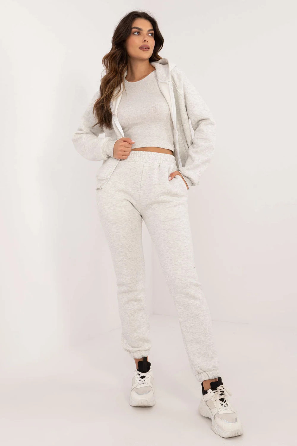 Dámská tepláková souprava ideální pro každodenní ležérní a sportovní styling, vyrobená ze směsi bavlny a elastanu. Souprava se skládá z krátkého trička na ramena, mikiny na zip s kapucí, dlouhými rukávy a nakládanými kapsami a kalhot s dlouhými nohavicemi a žebrovanými manžetami. Kalhoty mají vysoký náplet a boční kapsy pro větší pohodlí. Na zadní straně kalhot v úrovni hýždí je decentní potisk. Celkový design je zachován v melanžovém vzoru a dodatečné zateplení poskytuje pohodlí v chladnějších dnech. Jedná se o pohodlnou a stylovou volbu pro každodenní nošení.