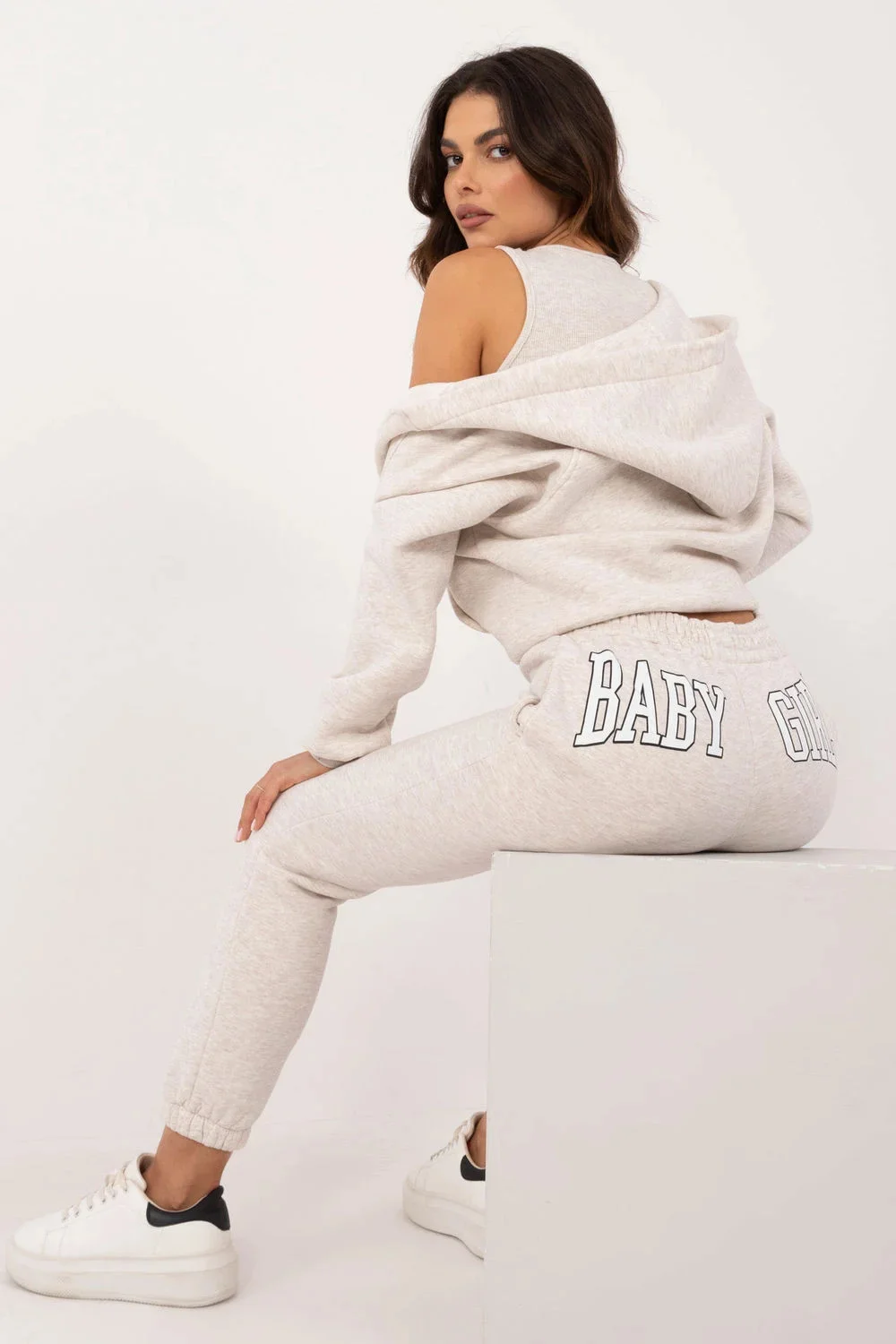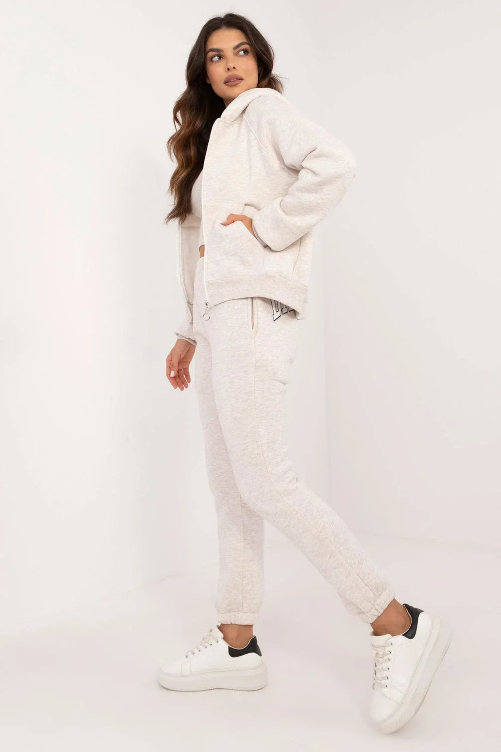 Dámská tepláková souprava ideální pro každodenní ležérní a sportovní styling, vyrobená ze směsi bavlny a elastanu. Souprava se skládá z krátkého trička na ramena, mikiny na zip s kapucí, dlouhými rukávy a nakládanými kapsami a kalhot s dlouhými nohavicemi a žebrovanými manžetami. Kalhoty mají vysoký náplet a boční kapsy pro větší pohodlí. Na zadní straně kalhot v úrovni hýždí je decentní potisk. Celkový design je zachován v melanžovém vzoru a dodatečné zateplení poskytuje pohodlí v chladnějších dnech. Jedná se o pohodlnou a stylovou volbu pro každodenní nošení.....