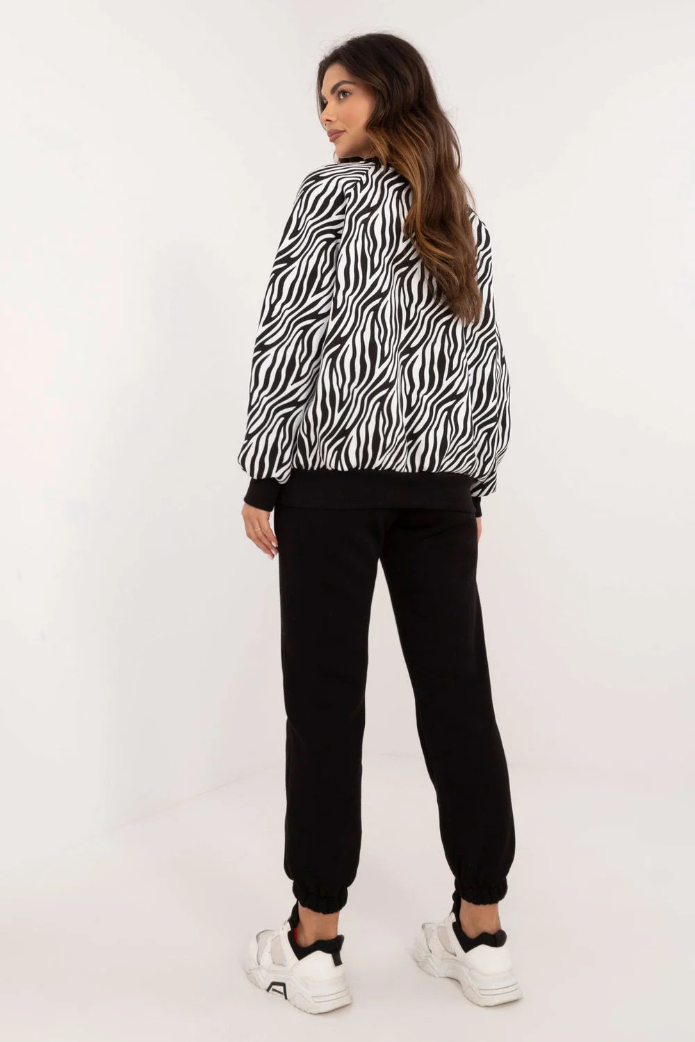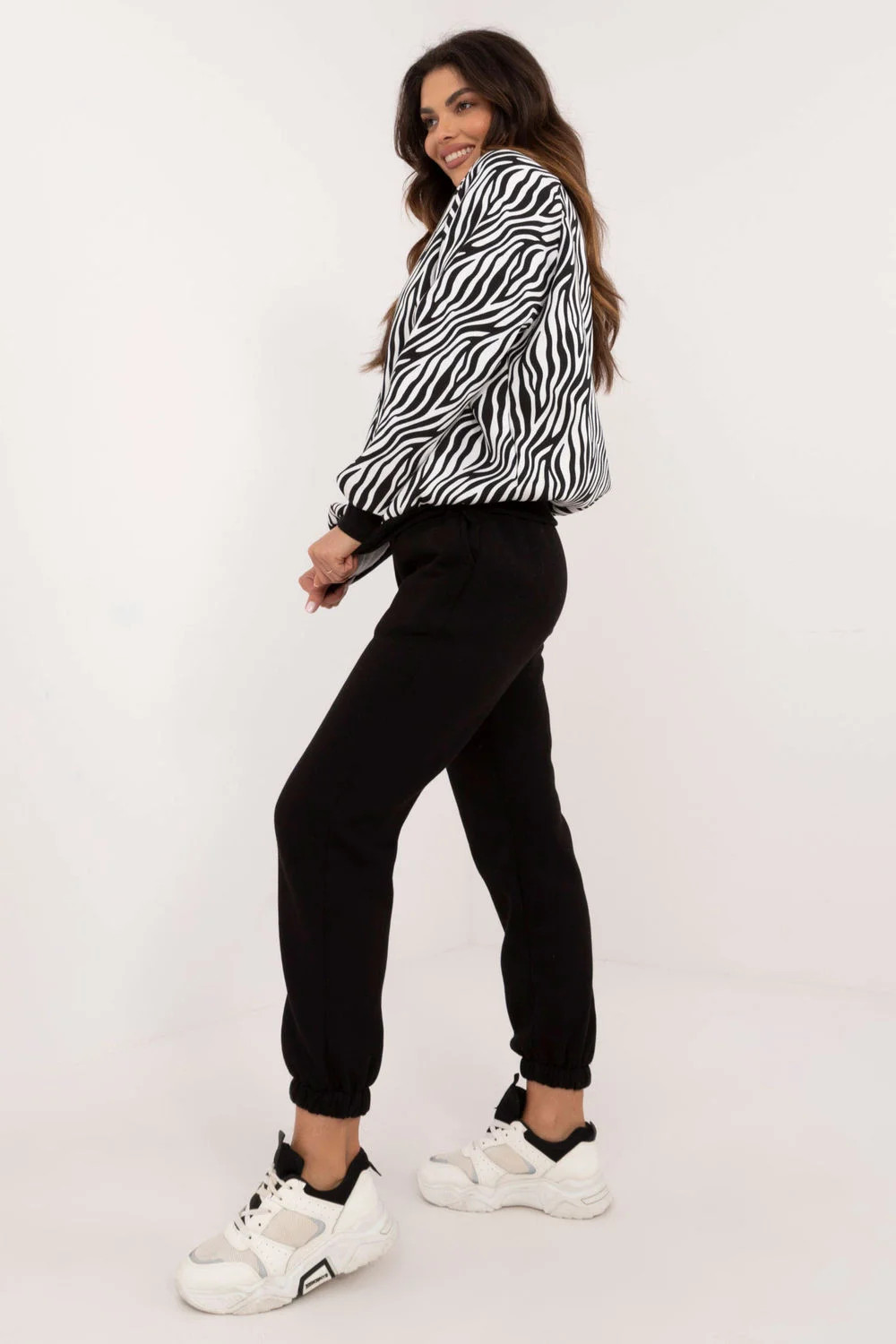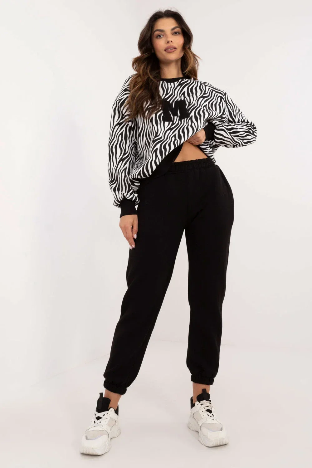 Tato jedinečná sada je ideální pro ženy, které ocení ležérní styl a originalitu. Bude ideální pro každodenní aktivity, poskytne teplo a pohodlí. Halenka s dlouhými rukávy, kulatým výstřihem a ozdobnou nášivkou na přední straně. Mikina z látky se zvířecím potiskem. Dlouhé hladké kalhoty s vysokým pasem, dlouhými nohavicemi a nakládanými kapsami.