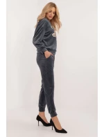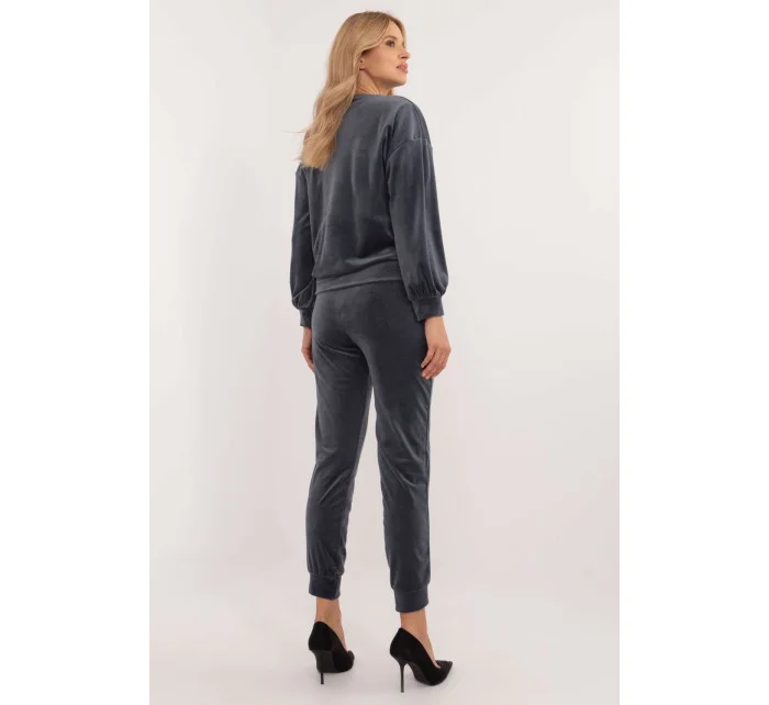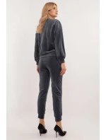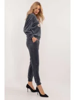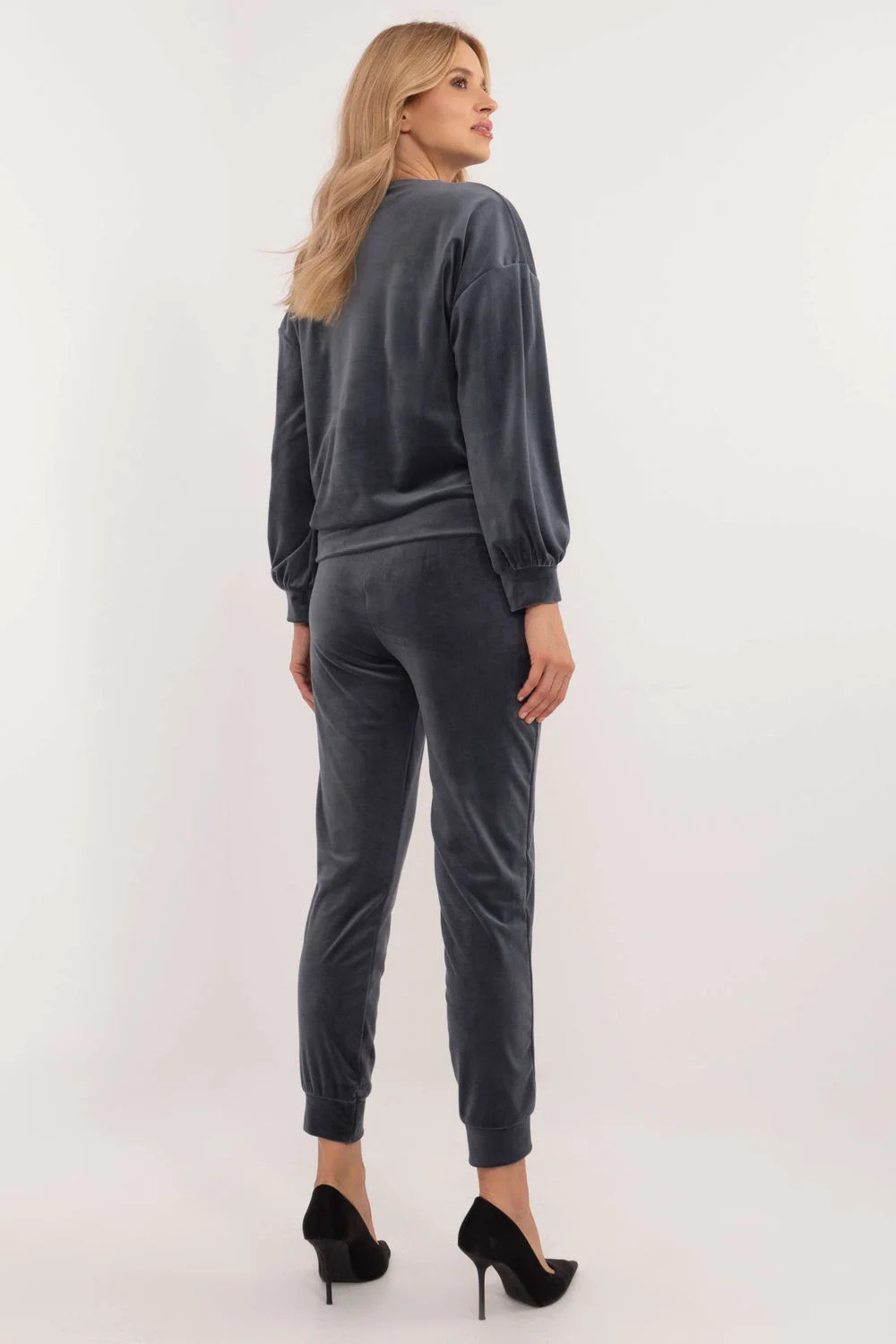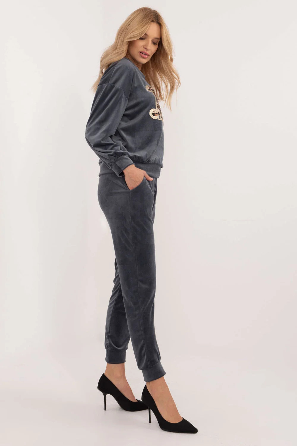 Dámská velurová souprava složená z halenky a kalhot, ideální pro každodenní příležitosti včetně práce, v ležérním stylu. Je vyroben z měkké směsi viskózy a elastanu a poskytuje pohodlí a volnost pohybu. Mikina s potiskem na přední straně dodává moderní, módní nádech, zatímco kulatý výstřih a dlouhé rukávy zdůrazňují klasický, pohodlný střih. Kalhoty mají vysoký náplet pro lichotivou siluetu a dlouhé žebrované nohavice pro sportovní vzhled. Praktickým doplňkem jsou postranní kapsy, které jsou ideální na každodenní nezbytnosti. Tato velurová souprava je dokonalou kombinací stylu a pohodlí pro běžné i neformální příležitosti.