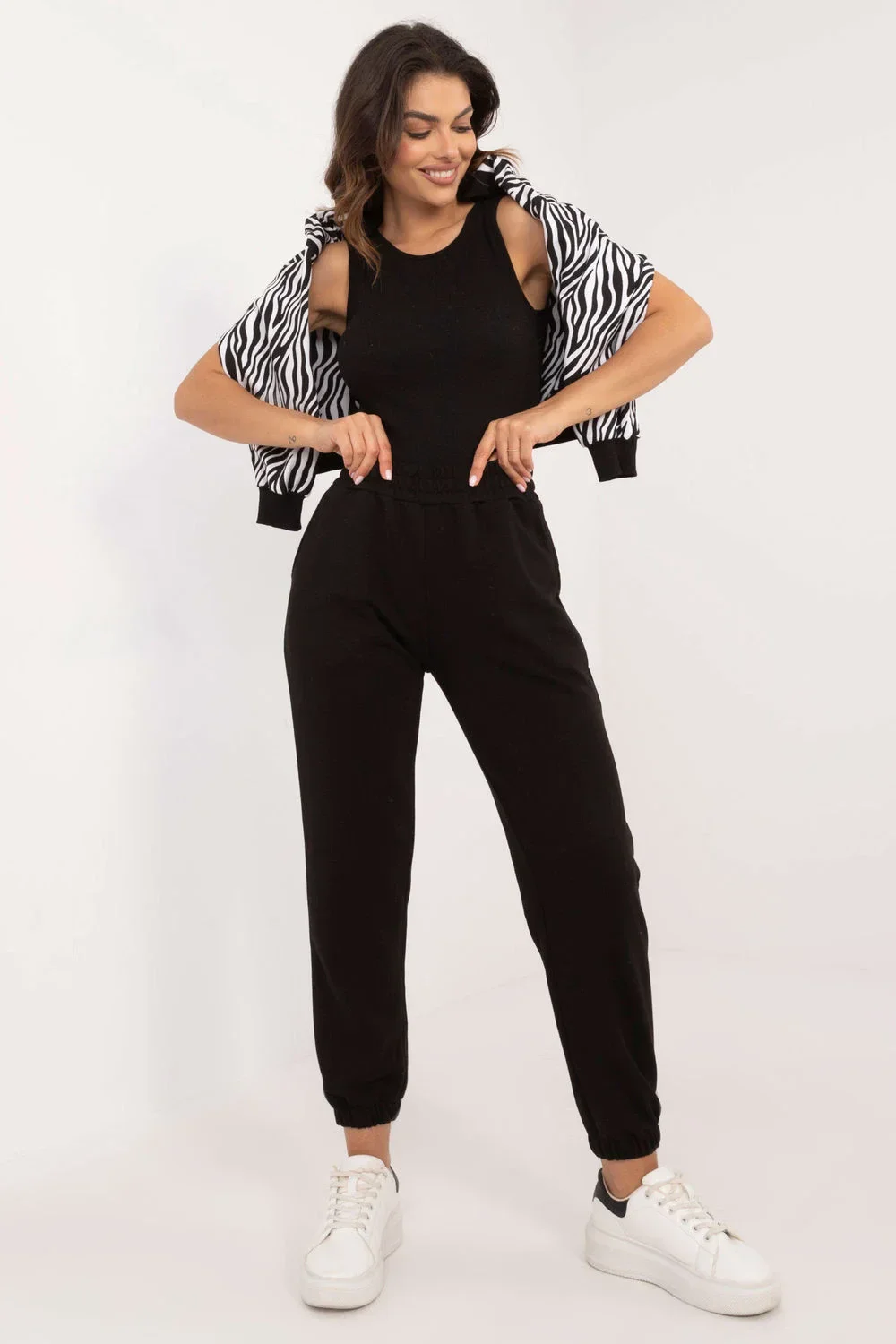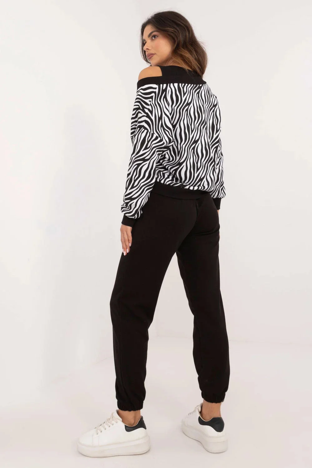 Tato dámská souprava v ležérním stylu, ideální pro každodenní nošení, se skládá ze tří kusů: trička, mikiny a kalhot. Souprava se vyznačuje hladkým vzorem s jemným akcentem zvířecího motivu, který jí dodává moderní a módní charakter. Převažujícím materiálem je směs bavlny a polyesteru, která zajišťuje pohodlí a odolnost. Kalhoty mají dlouhé nohavice zakončené žebrovanými manžetami a vysoký střih zdůrazňuje pas, což zajišťuje pohodlný a stylový vzhled. Bonusem jsou postranní kapsy, které jsou praktické a funkční. Blůza s dlouhými rukávy má výstřih do V, který působí žensky, zatímco tričko má klasický kulatý výstřih, který dokonale doplňuje celý komplet. Tato souprava je kombinací pohodlí a módního designu, ideální pro každodenní ležérní styling.