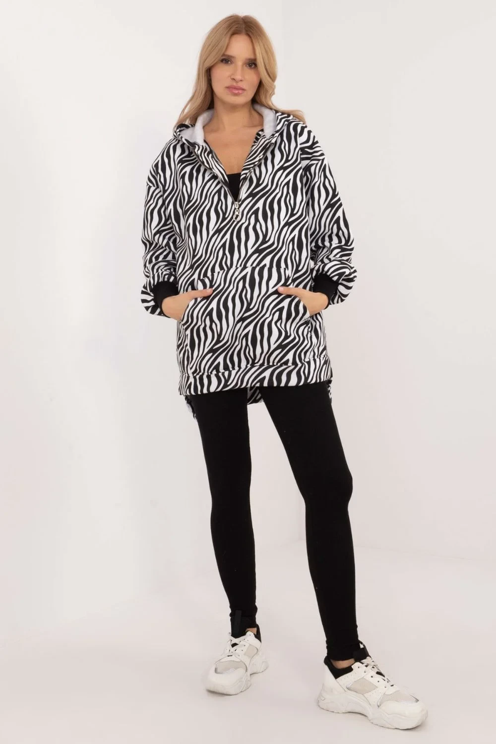 Dámský ležérní komplet, ideální pro každodenní nošení, se skládá z trička, mikiny a legín. Souprava má jednobarevný design legín s jemným zvířecím motivem na mikině, který jí dodává moderní nádech. Je vyrobena z příjemné směsi bavlny a polyesteru, takže poskytuje pohodlí a odolnost po celý den. Legíny mají dlouhé, zúžené nohavice a vysoký střih pro lichotivou siluetu a perfektní střih. Minimalistický styl legín bez kapes dodává eleganci a praktičnost. Mikina s dlouhým rukávem je zateplená, takže je ideální pro chladnější dny. Má kapuci a praktickou klokaní kapsu na přední straně, která jí dodává sportovní nádech. Mikina s polovičním zapínáním na zip umožňuje přizpůsobit si pohodlí a styl. Vzhled doplňte klasickým tričkem, čímž vytvoříte pohodlný a stylový komplet pro každodenní ležérní styling.