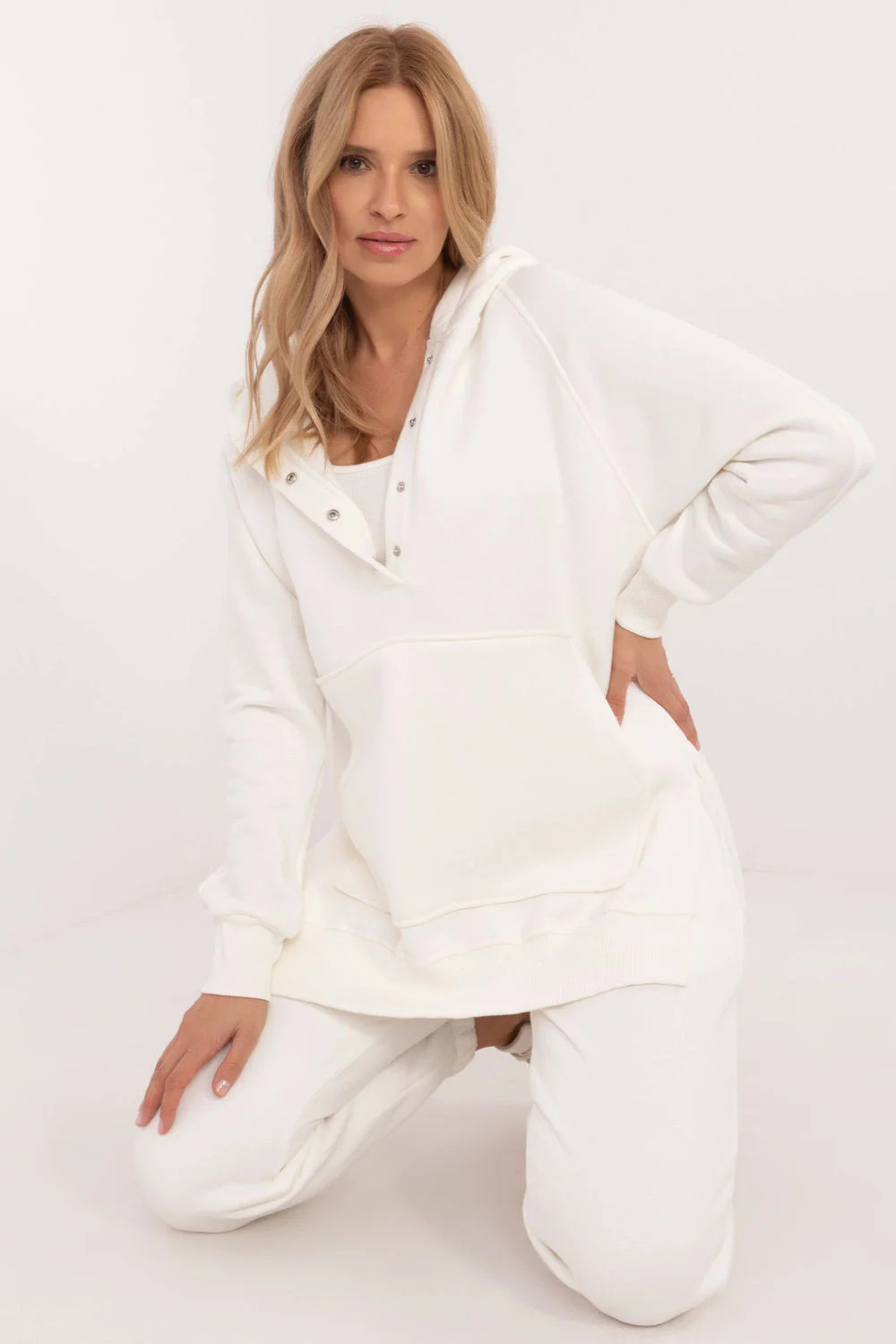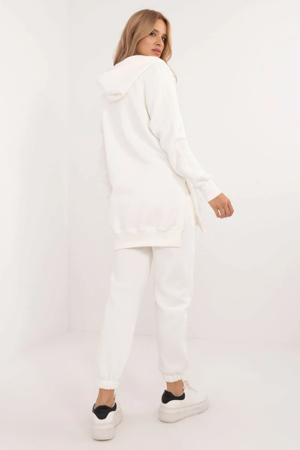 Zateplená dámská souprava v ležérním stylu, ideální pro chladnější dny a každodenní vycházky, se skládá z trička, mikiny a kalhot. Souprava se vyznačuje melanžovým vzorem, který jí dodává jedinečný nádech. Je vyrobena převážně z bavlny a poskytuje pohodlí a teplo, ideální pro podzimní a zimní dny. Kalhoty mají dlouhé nohavice s žebrovanými lemy a vysoký střih, který zvýrazňuje siluetu a zaručuje pohodlné nošení. V pase je stahovací šňůrka pro dokonalé přizpůsobení a zasouvací boční kapsy jsou praktickým řešením pro drobnosti. Mikina s dlouhým rukávem se zapíná do poloviny pomocí patentek, což jí dodává originalitu a usnadňuje oblékání. Má také kapuci a velkou klokaní kapsu, která dodává sportovní nádech a další funkčnost. Je doplněna klasickým tričkem, čímž vzniká pohodlný a stylový komplet, ideální pro každodenní styling v chladnějších dnech.