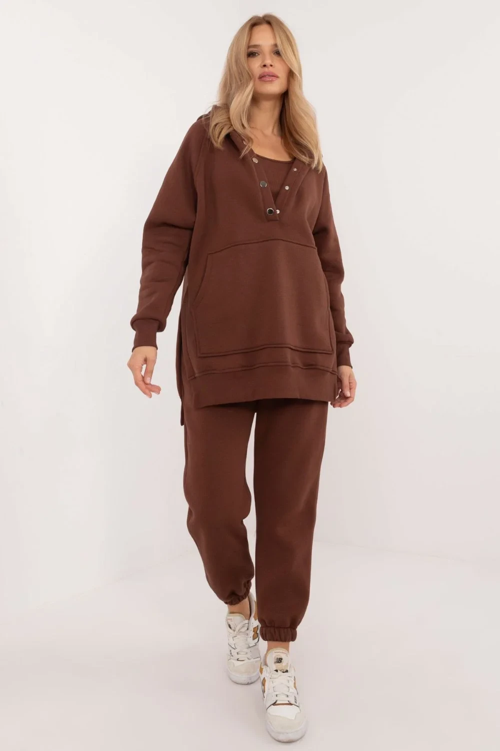 Zateplená dámská souprava v ležérním stylu, ideální pro chladnější dny a každodenní vycházky, se skládá z trička, mikiny a kalhot. Souprava se vyznačuje melanžovým vzorem, který jí dodává jedinečný nádech. Je vyrobena převážně z bavlny a poskytuje pohodlí a teplo, ideální pro podzimní a zimní dny. Kalhoty mají dlouhé nohavice s žebrovanými lemy a vysoký střih, který zvýrazňuje siluetu a zaručuje pohodlné nošení. V pase je stahovací šňůrka pro dokonalé přizpůsobení a zasouvací boční kapsy jsou praktickým řešením pro drobnosti. Mikina s dlouhým rukávem se zapíná do poloviny pomocí patentek, což jí dodává originalitu a usnadňuje oblékání. Má také kapuci a velkou klokaní kapsu, která dodává sportovní nádech a další funkčnost. Je doplněna klasickým tričkem, čímž vzniká pohodlný a stylový komplet, ideální pro každodenní styling v chladnějších dnech.