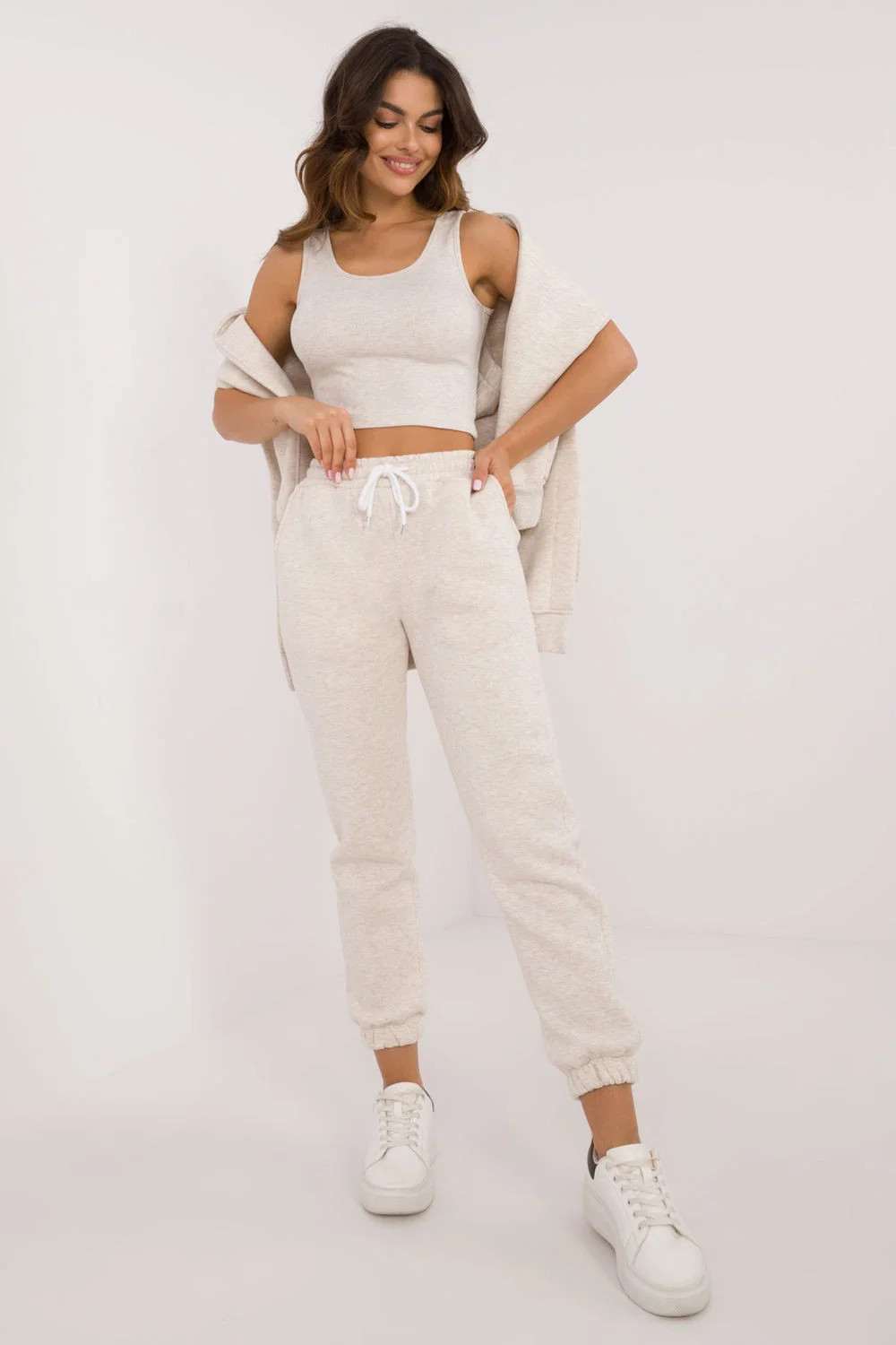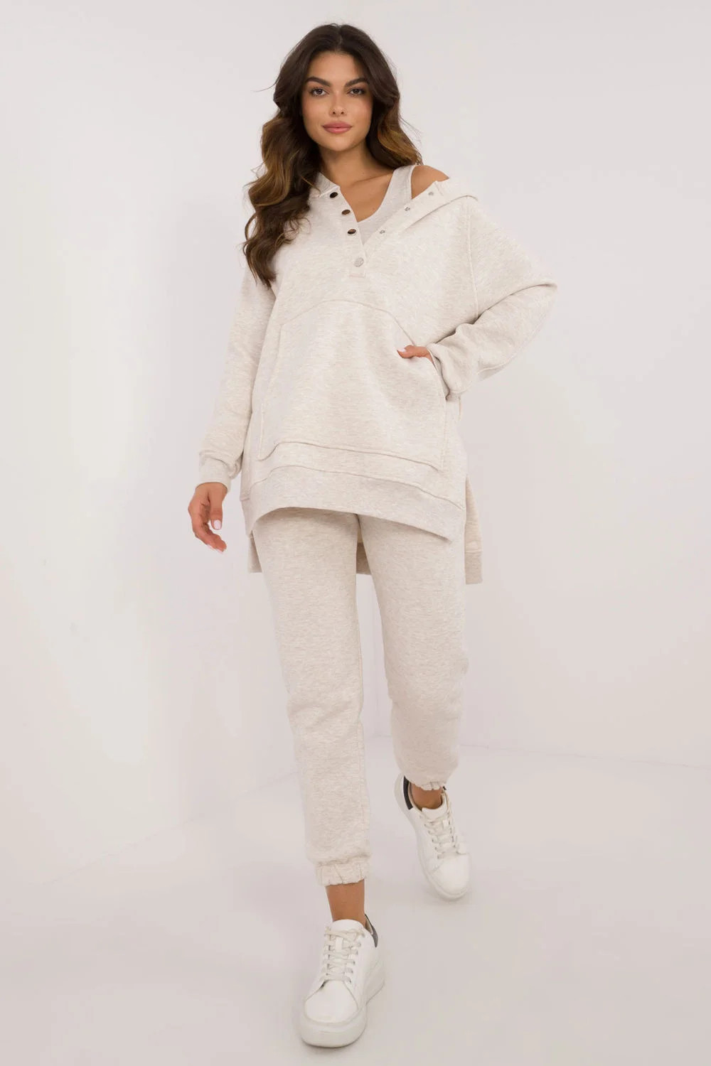 Zateplená dámská souprava v ležérním stylu, ideální pro chladnější dny a každodenní vycházky, se skládá z trička, mikiny a kalhot. Souprava se vyznačuje melanžovým vzorem, který jí dodává jedinečný nádech. Je vyrobena převážně z bavlny a poskytuje pohodlí a teplo, ideální pro podzimní a zimní dny. Kalhoty mají dlouhé nohavice s žebrovanými lemy a vysoký střih, který zvýrazňuje siluetu a zaručuje pohodlné nošení. V pase je stahovací šňůrka pro dokonalé přizpůsobení a zasouvací boční kapsy jsou praktickým řešením pro drobnosti. Mikina s dlouhým rukávem se zapíná do poloviny pomocí patentek, což jí dodává originalitu a usnadňuje oblékání. Má také kapuci a velkou klokaní kapsu, která dodává sportovní nádech a další funkčnost. Je doplněna klasickým tričkem, čímž vzniká pohodlný a stylový komplet, ideální pro každodenní styling v chladnějších dnech.
