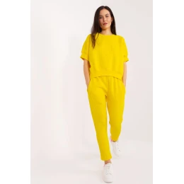 Zateplená dámská tepláková souprava v ležérním stylu, ideální pro chladnější dny, se skládá z mikiny a kalhot. Souprava je vyrobena z kombinace bavlny a polyesteru, poskytuje teplo, pohodlí a odolnost a je ideální pro každodenní nošení. Mikina standardní délky má krátké rukávy a kulatý výstřih, díky čemuž působí navzdory hřejivosti lehkým a ležérním dojmem. Na přední straně mikiny je módní potisk, který soupravě dodává originalitu a mladistvý nádech. Hladký design zachovává minimalistický, univerzální vzhled, který lze snadno kombinovat s dalšími kusy oblečení. Kalhoty mají zúžené nohavice a vysoký pas, který zvýrazňuje siluetu a zajišťuje pohodlí. V pase je elastický pásek, který zaručuje dokonalé přizpůsobení. Kalhoty jsou navíc vybaveny postranními nakládanými kapsami, takže jsou praktickou volbou pro každodenní nošení. Tato souprava je dokonalou kombinací pohodlí a stylu pro chladné všední dny.