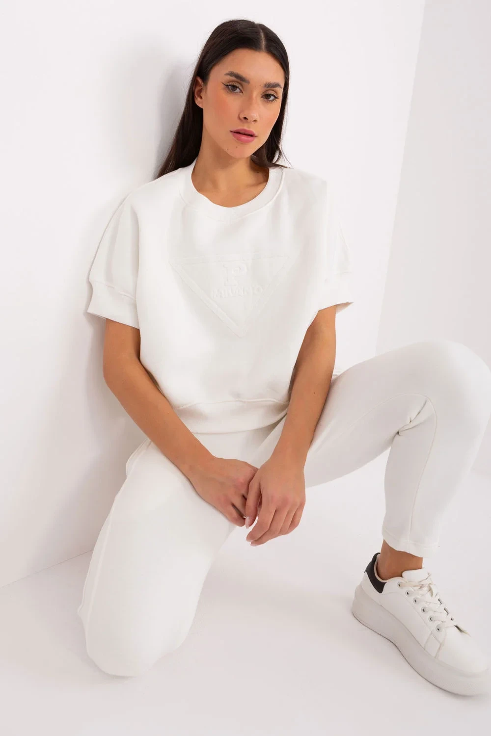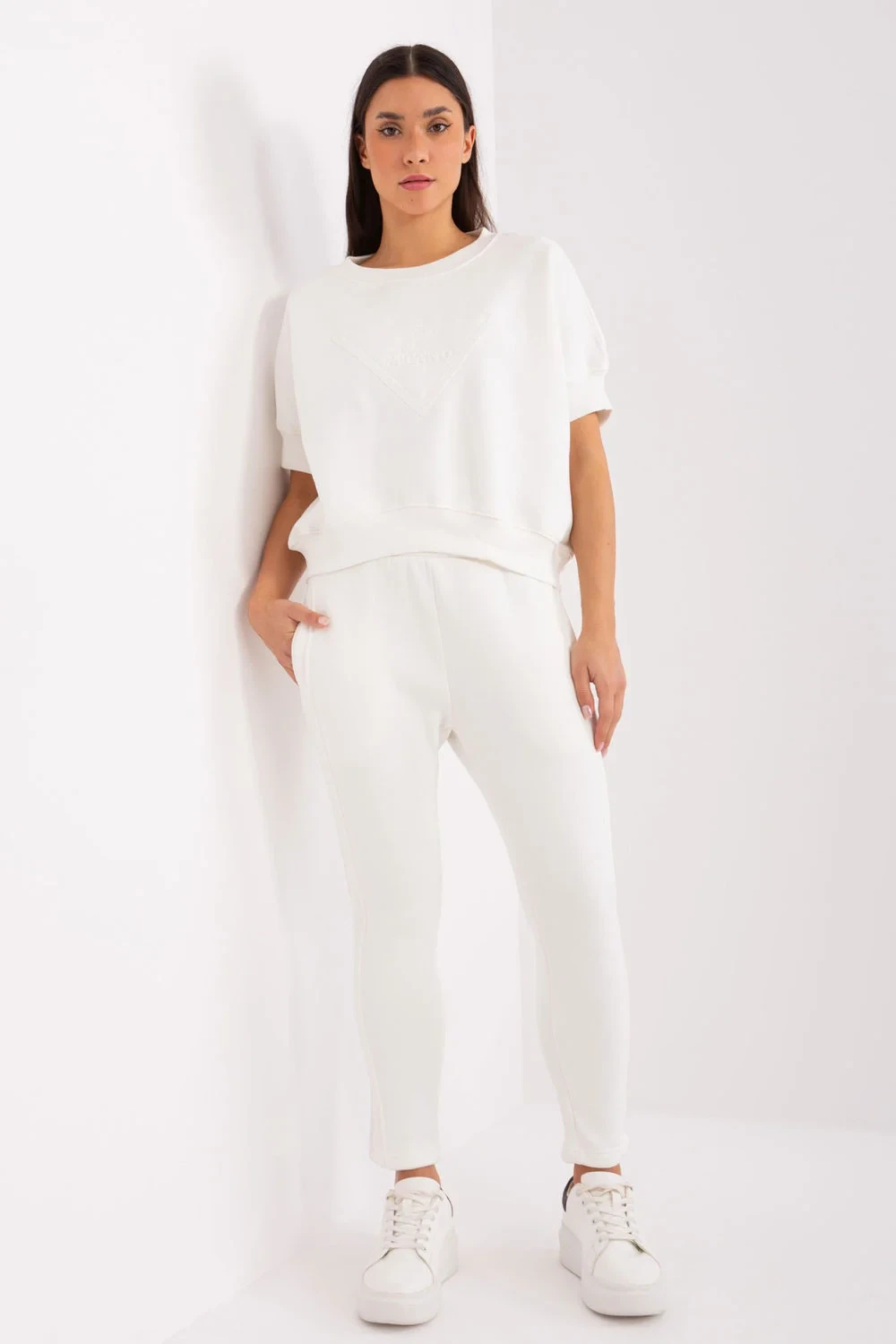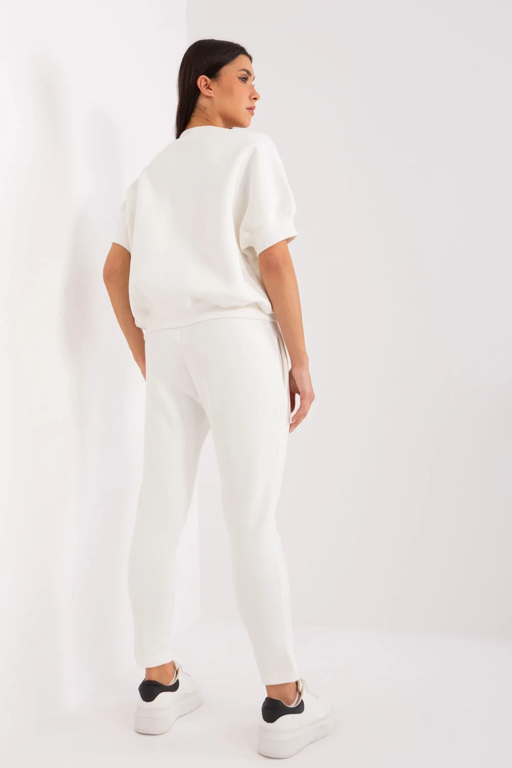 Zateplená dámská tepláková souprava v ležérním stylu, ideální pro chladnější dny, se skládá z mikiny a kalhot. Souprava je vyrobena z kombinace bavlny a polyesteru, poskytuje teplo, pohodlí a odolnost a je ideální pro každodenní nošení. Mikina standardní délky má krátké rukávy a kulatý výstřih, díky čemuž působí navzdory hřejivosti lehkým a ležérním dojmem. Na přední straně mikiny je módní potisk, který soupravě dodává originalitu a mladistvý nádech. Hladký design zachovává minimalistický, univerzální vzhled, který lze snadno kombinovat s dalšími kusy oblečení. Kalhoty mají zúžené nohavice a vysoký pas, který zvýrazňuje siluetu a zajišťuje pohodlí. V pase je elastický pásek, který zaručuje dokonalé přizpůsobení. Kalhoty jsou navíc vybaveny postranními nakládanými kapsami, takže jsou praktickou volbou pro každodenní nošení. Tato souprava je dokonalou kombinací pohodlí a stylu pro chladné všední dny.