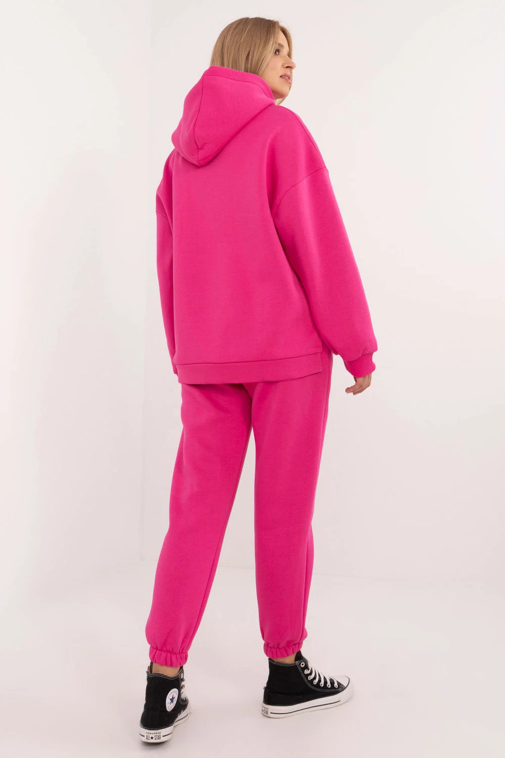Zateplený dámský teplákový set v casual stylu, ideální na každý den, chladnější dny, se skládá z mikiny a kalhot. Set je vyroben z měkké a teplé směsi bavlny a polyesteru, co zajišťuje pohodlí a odolnost. Mikina má dlouhý rukáv, kapuci a velkou praktickou kapsu typu klokánek, která dodává sportovní akcent a funkčnost. Díky zateplení je mikina ideální na chladné dny a její hladký vzor dodává klasický univerzální vzhled. Kalhoty s dlouhými nohavicemi zakončenými manžetami mají vysoký pas, který zdůrazňuje pas a zajišťuje pohodlí. V pase je šňůrka, která umožňuje ideální přizpůsobení. Navíc mají kalhoty boční kapsy, což z nich činí praktickou volbu na každý den. Celý set spojuje styl, pohodlí a teplotu, což je skvělá volba pro casual stylizace.