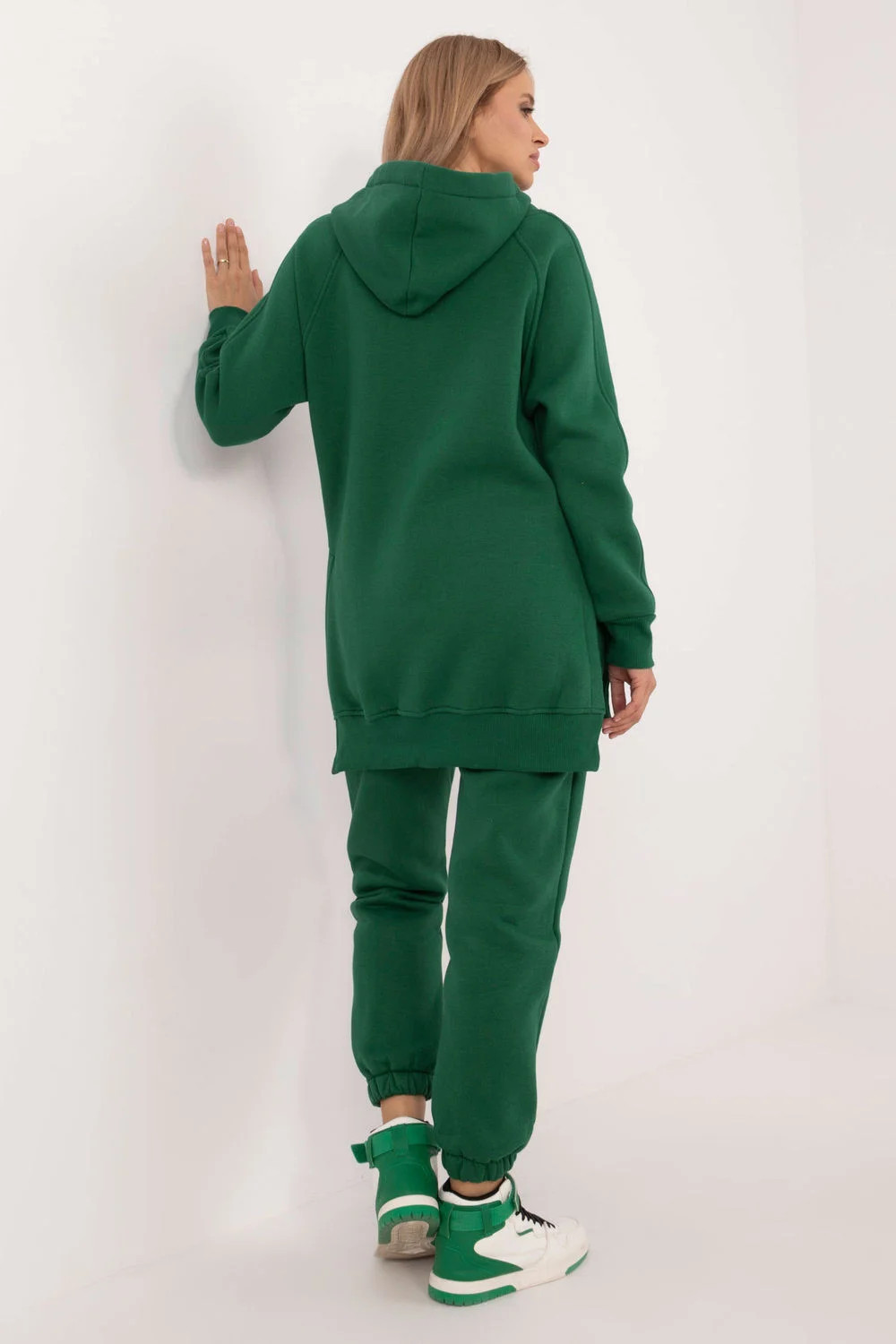 Zateplený dámský set ve stylu casual, ideální na chladnější dny a každodenní nošení, se skládá z trička, mikiny a kalhot. Set je výrazný díky melírovému vzoru, který mu dodává jedinečný charakter. Vyrobený hlavně z bavlny, poskytuje pohodlí a teplo, ideální na podzimní a zimní dny. Kalhoty mají dlouhé nohavice s manžetami a vysokým pasem, který zdůrazňuje siluetu a zaručuje pohodlné nošení. V pase je šňůrka, která umožňuje ideální přizpůsobení se postavě, a zapínání na napy do poloviny zajišťuje originalitu a usnadňuje oblékání. Mikina s dlouhým rukávem je zapínána na nýtky do poloviny, co jí dodává originalitu a usnadňuje oblékání. Má také kapuci a velkou kapsu typu klokánek, co dodává sportovní nádech a dodatečnou funkčnost. Celkový dojem doplňuje klasické tričko, vytvářející pohodlný a stylový set, ideální na každodenní střihy v chladnějších dnech.