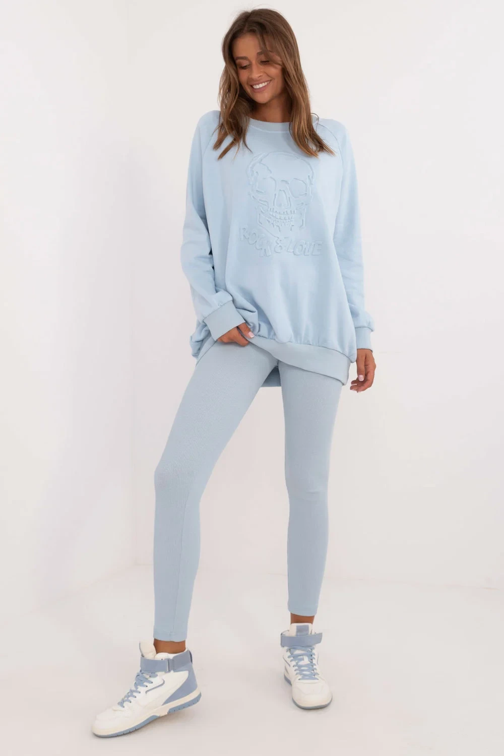 Dámská souprava sestávající z legín a mikiny, ideální pro každodenní ležérní styling. Je vyrobena z vysoce kvalitní bavlny s přídavkem elastanu a zajišťuje pohodlné nošení a přiléhavý střih. Legíny se zúženými nohavicemi, žebrovaným materiálem a vysokým pasem zvýrazňují postavu a zároveň nabízejí pohodlí a volnost pohybu. Mikina s dlouhými rukávy a kulatým výstřihem má na přední straně vyražený obrázek, který soupravě dodává originální nádech. Hladký vzor dominuje celému kompletu, takže je univerzální volbou pro každou každodenní příležitost.