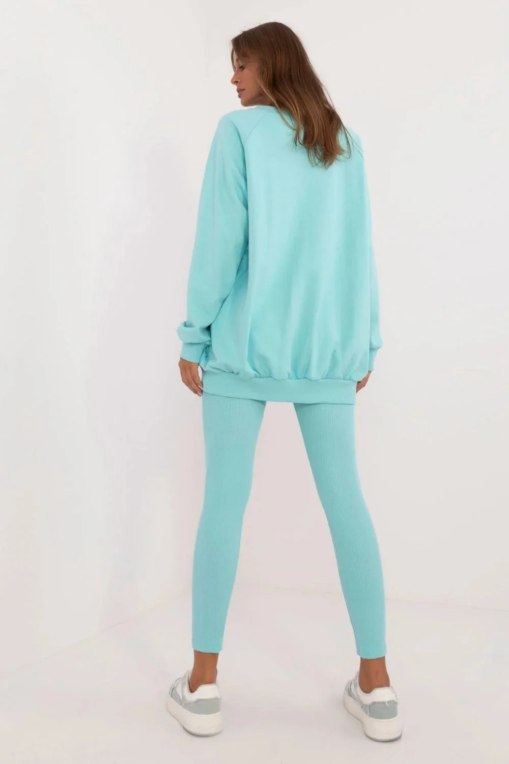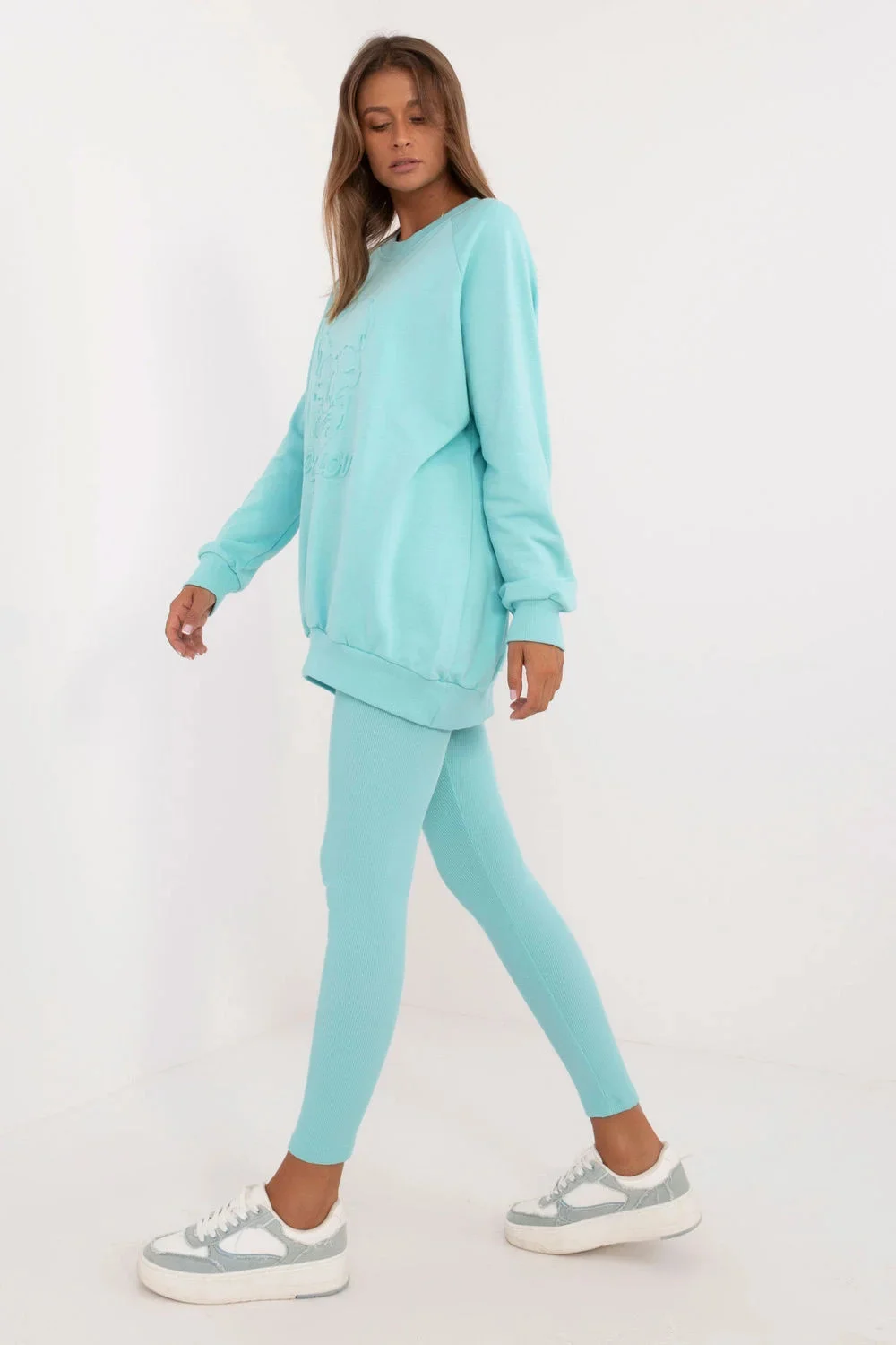 Dámská souprava sestávající z legín a mikiny, ideální pro každodenní ležérní styling. Je vyrobena z vysoce kvalitní bavlny s přídavkem elastanu a zajišťuje pohodlné nošení a přiléhavý střih. Legíny se zúženými nohavicemi, žebrovaným materiálem a vysokým pasem zvýrazňují postavu a zároveň nabízejí pohodlí a volnost pohybu. Mikina s dlouhými rukávy a kulatým výstřihem má na přední straně vyražený obrázek, který soupravě dodává originální nádech. Hladký vzor dominuje celému kompletu, takže je univerzální volbou pro každou každodenní příležitost.