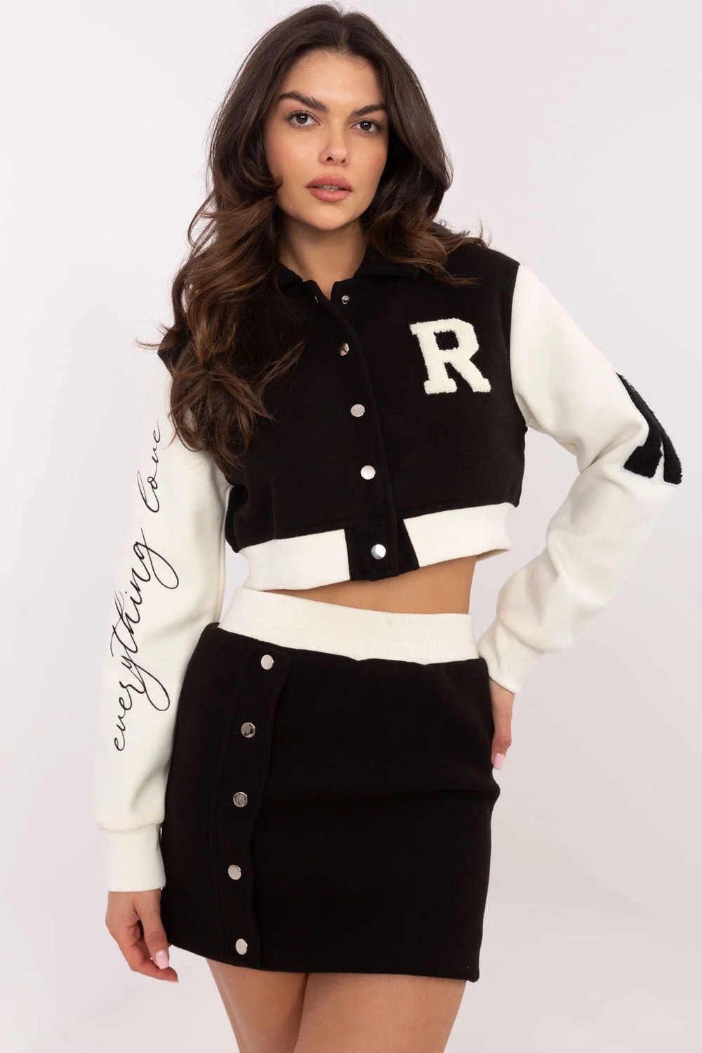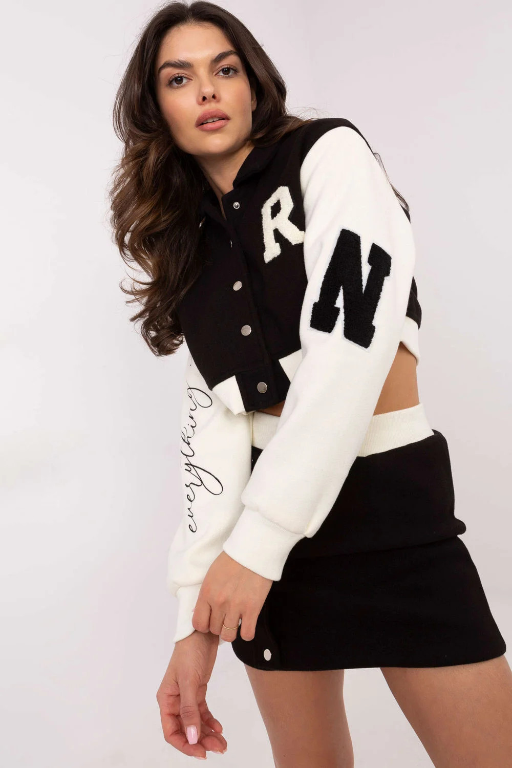 Elegantní a pohodlný dámský set ve stylu casual, ideální na každodenní příležitosti. Vyrobený z odolného polyesteru s podšívkou, poskytuje pohodlí nošení a moderní vzhled. Mikina s krátkou délkou má dlouhý rukáv, stojáček a praktické zapínání na stiskací knoflíky, které zdůrazňuje její sportovní charakter. Dekorativní nášivky na rukávu a přední části a vyšívání na druhém rukávu dodávají originalitu. Sukně s krátkou délkou je vybavena širokým pásem, což zaručuje pohodlné přizpůsobení a zdůraznění pasu. Hladký vzor setu mu dodává univerzálnost, skvěle se hodí jak k minimalistickým, tak k výraznějším stylizacím. Jedná se o praktický a módní set pro ženy, které chtějí spojit pohodlí s výrazným designem.