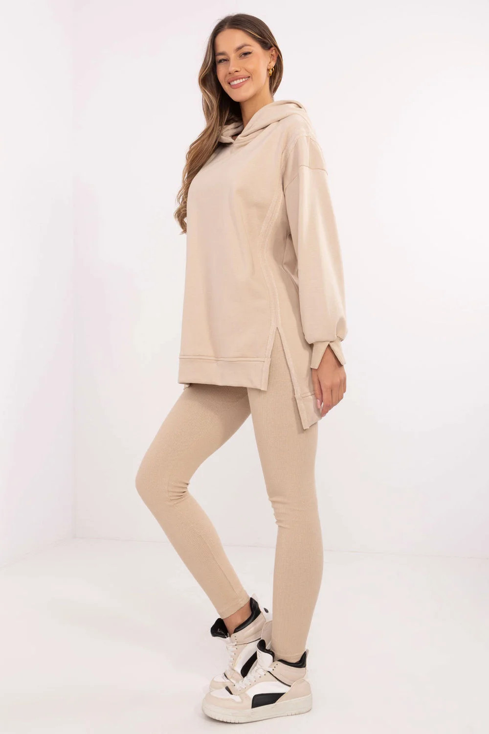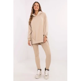 Dámský komplet skládající se z dlouhé mikiny a legín je ideální volbou pro ženy, které ocení pohodlí a styl ve svých každodenních outfitcích. Udržovaný v casualovém stylu, bude skvělý na procházku, nákupy nebo relaxaci v domácím útulku. Mikina má prodloužený zádový díl, který jí dodává moderní vzhled a zajišťuje další pohodlí při nošení. Vyrobená z směsi bavlny a polyesteru nabízí příjemný dotek a odolnost. S kapucí a dlouhým rukávem skvěle chrání před chladem v chladnějších dnech. Legíny se zúženými nohavicemi a vysokým pasem zdůrazňují postavu a zároveň zajistí volnost pohybu. Vyrobené z bavlny s přídavkem elastanu se ideálně přizpůsobí tělu. Další výhodou je pruhovaný materiál, který jim dodává charakter a odlišuje je od ostatních modelů. Celkový vzhled je udržován v jednobarevném, hladkém vzoru, což umožňuje snadné sladění doplňků a vytvoření souvislého, každodenního looku. Složení materiálu: Mikina: 70% bavlna, 30% polyester Legíny: 90% bavlna, 10% elastan