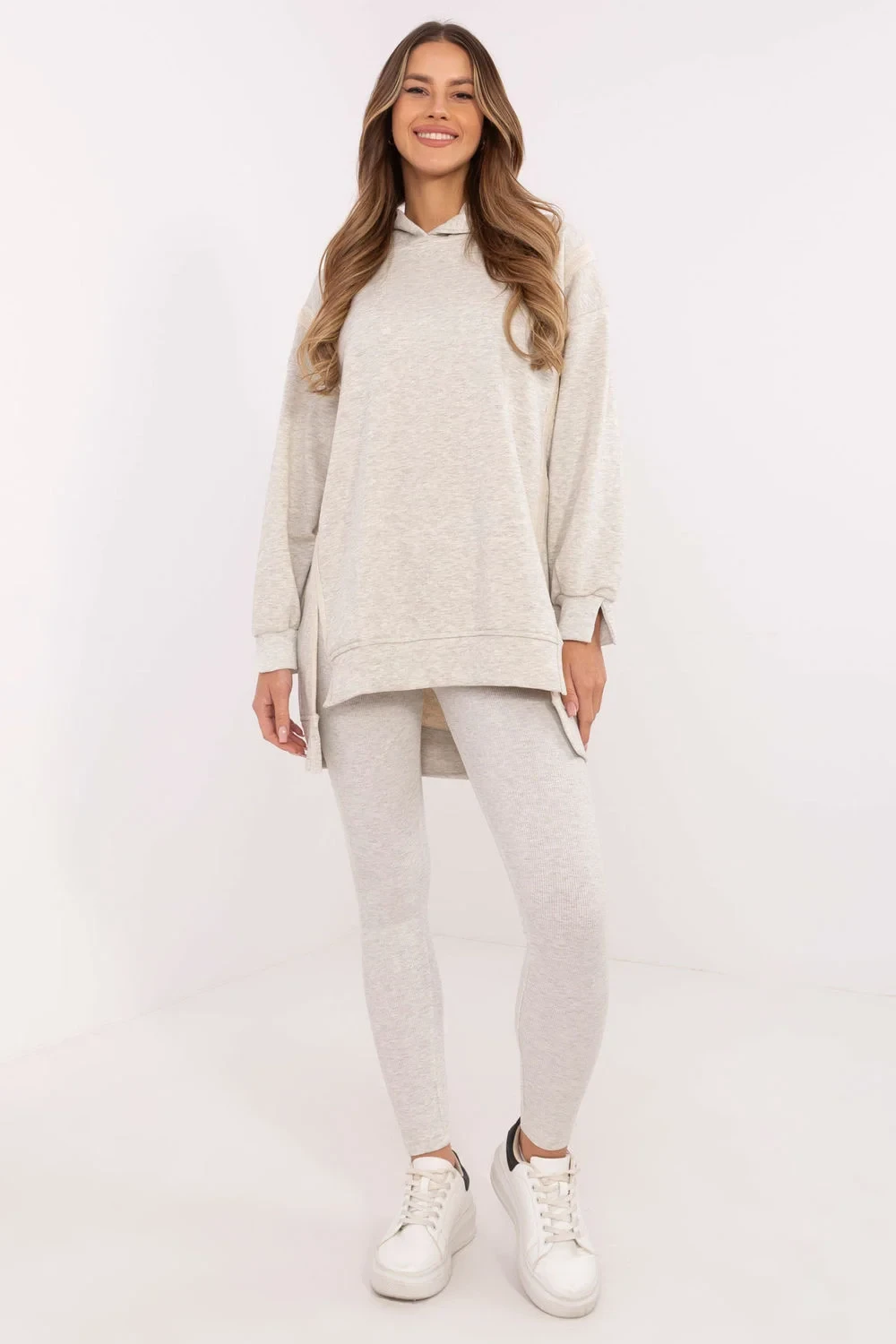Dámský komplet skládající se z dlouhé mikiny a legín je ideální volbou pro ženy, které ocení pohodlí a styl ve svých každodenních outfitcích. Udržován v casualovém stylu, bude skvělý na procházku, nákupy nebo relaxaci doma. Mikina má prodloužený záda, co jí dodává moderní vzhled a zajišťuje dodatečný komfort nošení. Vyrobená z kombinace bavlny a polyesteru nabízí příjemný dotek a odolnost. S kapucí a dlouhým rukávem skvěle chrání před chladnými dny. Legíny s úzkými nohavicemi a vysokým pasem zdůrazňují siluetu a zároveň zajistí volnost pohybu. Vyrobené z bavlny s přídavkem elastanu se ideálně přizpůsobí tělu. Další výhodou je pruhovaný materiál, který přidává charakter a odlišuje je od ostatních modelů. Celkově jednotný, hladký vzor umožňuje snadné sladění doplňků a vytvoření souvislého každodenního vzhledu. Složení materiálu: Mikina: 70% bavlna, 30% polyester Legíny: 90% bavlna, 10% elastan
