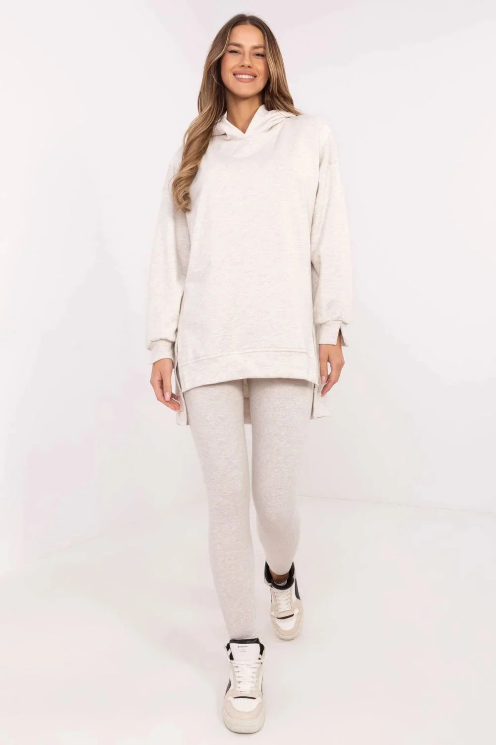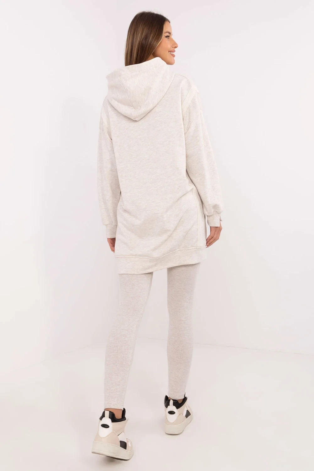 Kompletní dámský set skládající se z dlouhé mikiny a legín je ideální volbou pro ženy, které ocení pohodlí a styl ve svých každodenních outfitcích. V casualovém stylu je vhodný na procházky, nákupy nebo relaxaci doma. Mikina má prodloužený zádový díl, který jí dodává moderní vzhled a zajišťuje další pohodlí při nošení. Vyrobena z bavlněné směsi a polyesteru nabízí příjemný dotek a odolnost. S kapucí a dlouhým rukávem perfektně chrání před chladem v chladnějších dnech. Legíny se zužujícími nohavicemi a vysokým pasem zdůrazňují postavu a zároveň poskytují volnost pohybu. Vyrobena z bavlny s přídavkem elastanu, se skvěle přizpůsobují tělu. Další výhodou je pruhovaný materiál, který jim dodává charakter a odlišuje je od ostatních modelů. Celkový vzhled je jednotný, hladký, což umožňuje snadné sladění doplňků a vytvoření souvislého každodenního looku. Složení materiálu: Mikina: 70% bavlna, 30% polyester Legíny: 90% bavlna, 10% elastan