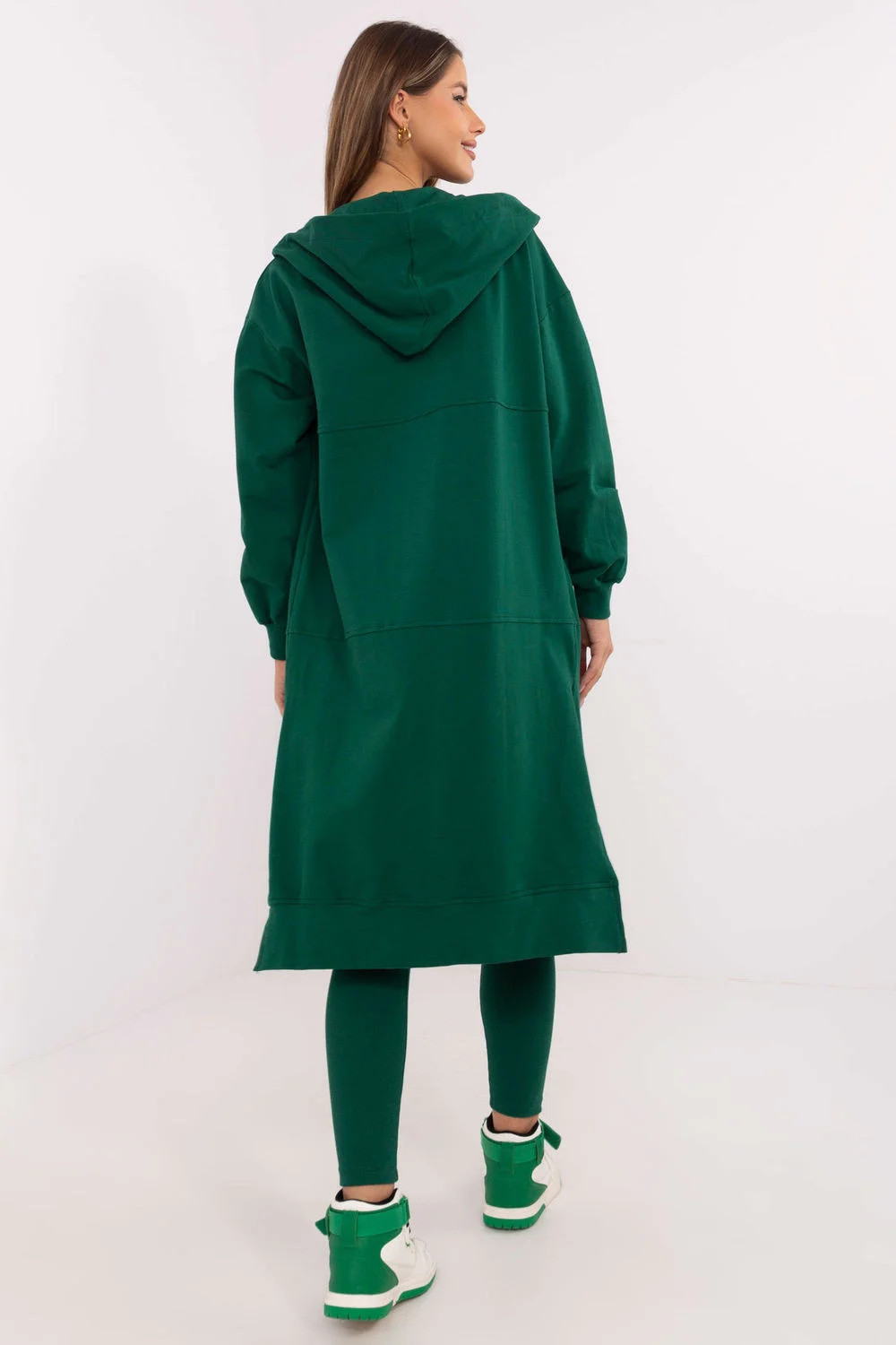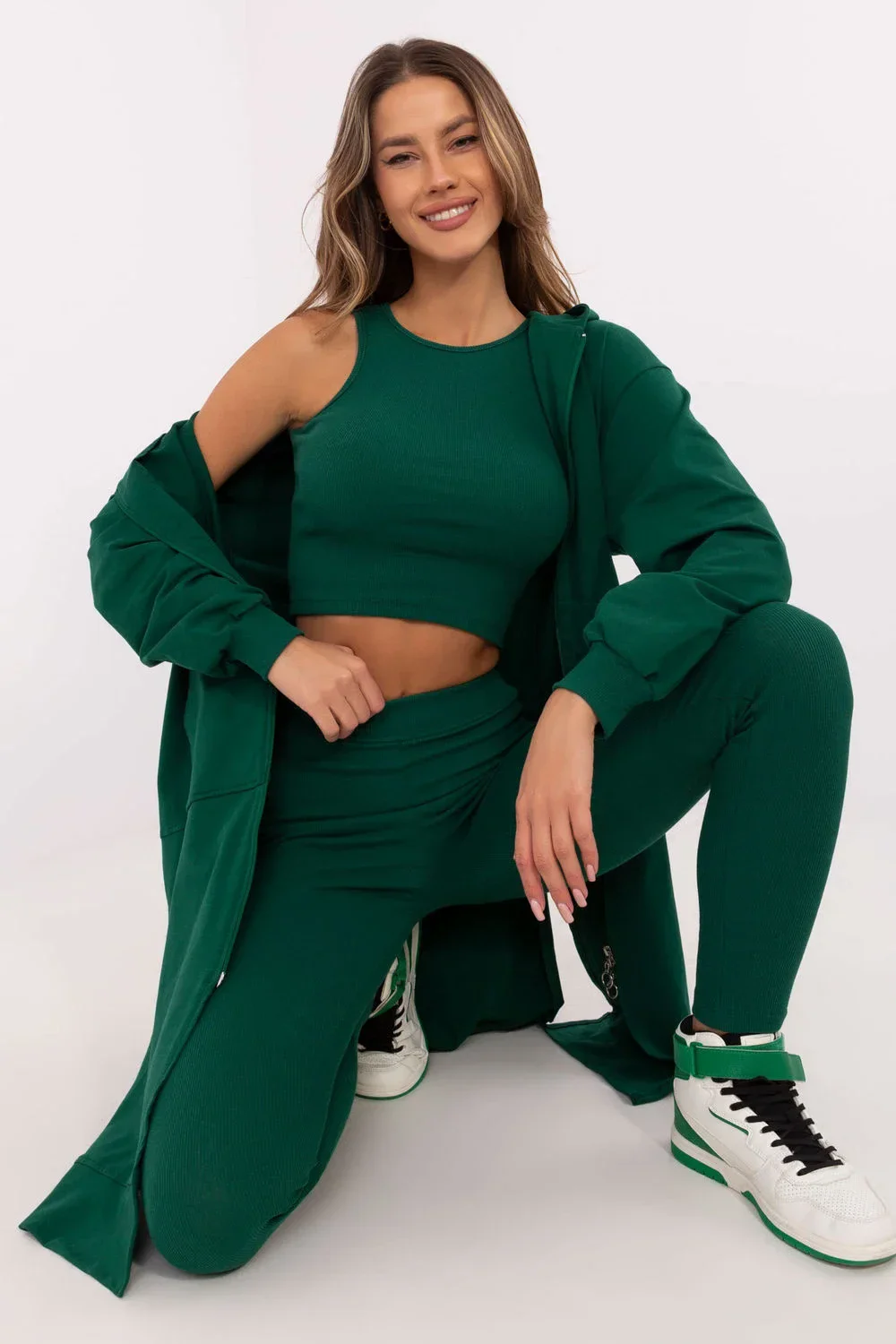Dámský set skládající se z mikiny, topu a legín je harmonické spojení casualového a sportovního stylu. Vytvořen s ohledem na každodenní pohodlí a aktivitu, skvěle poslouží jak při cvičení, tak během relaxace. Mikina s prodlouženým střihem je praktickým řešením pro chladnější dny. Zapíná se na zip a je vybavena vloženými kapsami, což zajišťuje pohodlí a funkčnost. Vyrobená z kombinace bavlny, polyesteru a elastanu spojuje měkkost s pružností. Dlouhý rukáv a kapuce navíc chrání před větrem a chladem. Top s kulatým výstřihem je jednoduchý, ale zároveň univerzální, ideálně padne k celému setu. Jeho složení z bavlny a elastanu zaručuje prodyšnost a pohodlí nošení. Legíny se zužujícími se nohavicemi a vysokým pasem zdůrazňují postavu, zároveň zajišťují plnou volnost pohybu. Vyrobené z bavlny a elastanu se vyznačují pružností a odolností. Dalším výrazným prvkem je pruhovaná struktura materiálu, která jim dodává jedinečný charakter. Celkový hladký vzor se skvěle hodí k každodennímu sportovnímu vzhledu, nabízí styl i maximální pohodlí užívání.