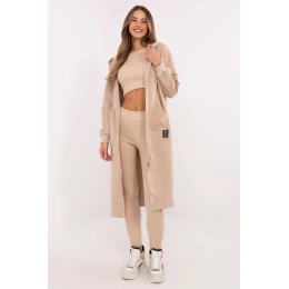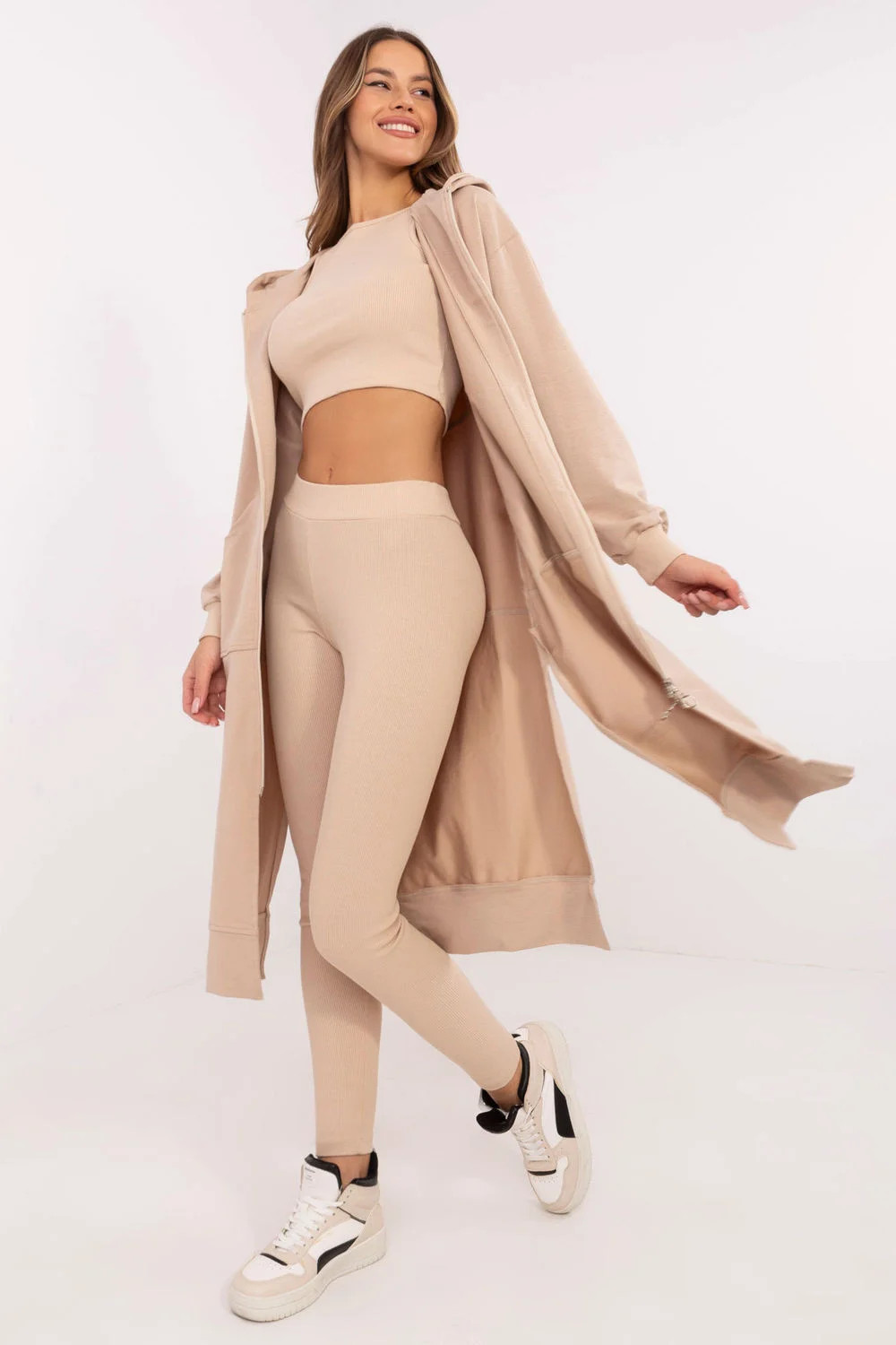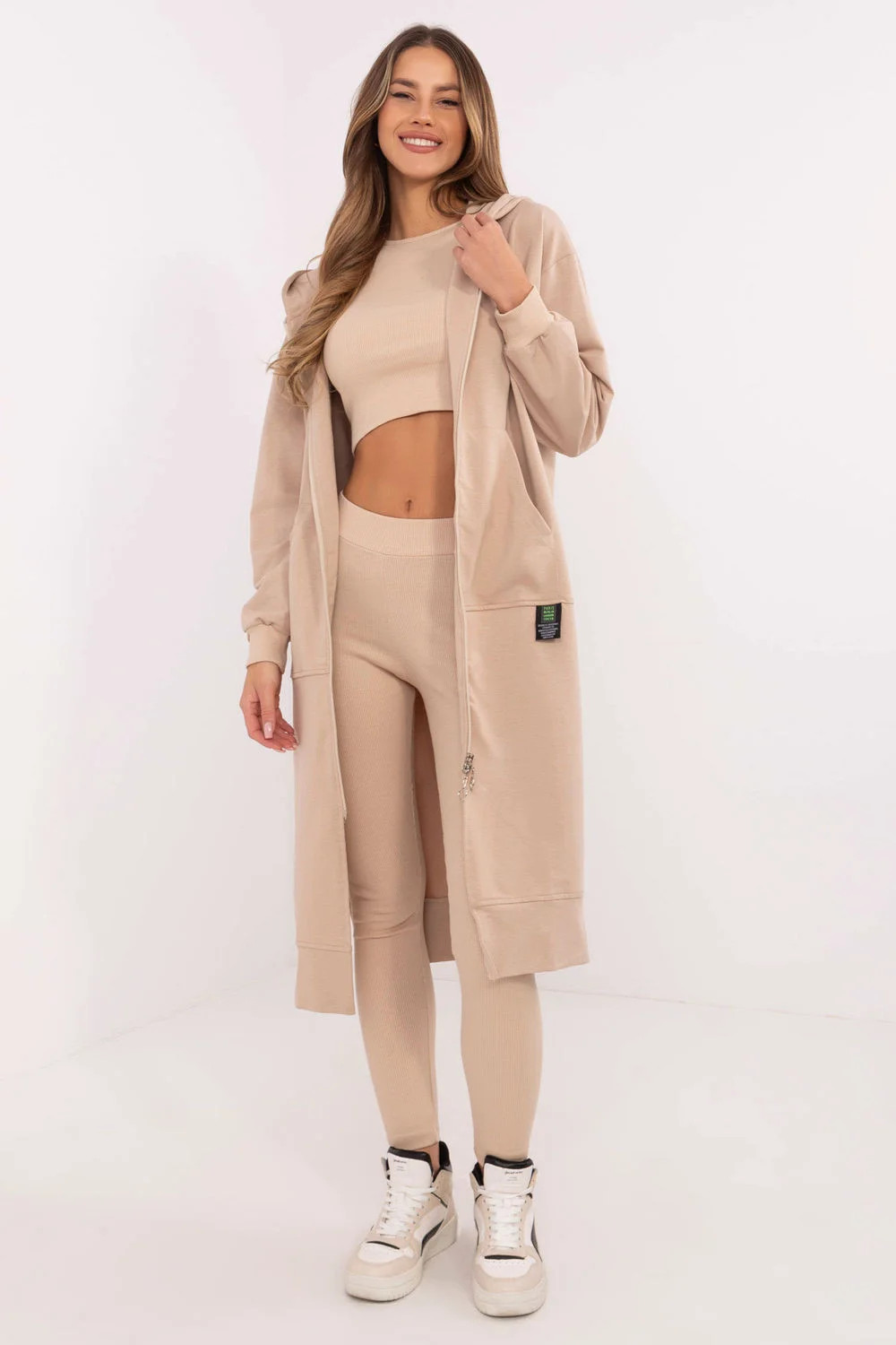 Dámský set skládající se z mikiny, topu a legín je harmonickou kombinací casual stylu a sportu. Vytvořen s ohledem na každodenní pohodlí a aktivitu, skvěle poslouží jak při cvičení, tak během relaxace. Mikina s prodlouženým střihem je praktickým řešením pro chladnější dny. Zapíná se na zip a je vybavena kapsami, což zajišťuje pohodlí a funkčnost. Vyrobená z směsi bavlny, polyesteru a elastanu spojuje měkkost s pružností. Dlouhý rukáv a kapuce dále chrání před větrem a chladem. Top s kulatým výstřihem je jednoduchý, ale zároveň univerzální, ideálně padne ke kompletnímu outfitu. Jeho složení z bavlny a elastanu zaručuje prodyšnost a pohodlí nošení. Legíny se zužujícími se nohavicemi a vysokým pasem zdůrazňují postavu, zároveň zajišťují plnou volnost pohybu. Vyrobené z bavlny a elastanu jsou elastické a odolné. Dalším výrazným prvkem je proužkovaná struktura materiálu, která jim dodává jedinečný charakter. Celkově drženo v hladkém vzoru, skvěle zapadá do každodenního sportovního looku, nabízejíc jak styl, tak maximální pohodlí užívání. Složení materiálu: Mikina: 72% bavlna, 22% polyester, 6% elastan Legíny a top: 90% bavlna, 10% elastan